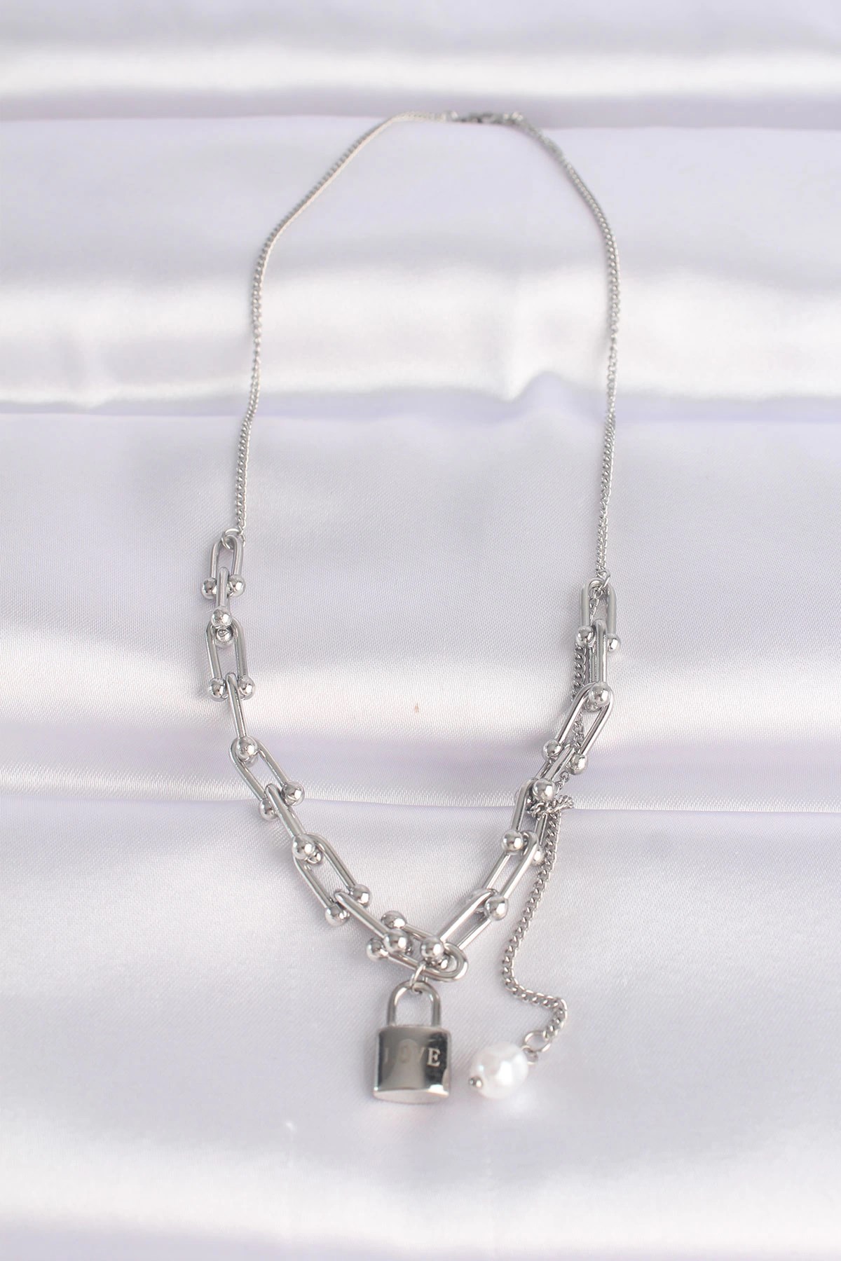 Mey İthalat® 316L Çelik Zincir Gümüş Renk Zincirli Love Yazılı Kilit Kolye
