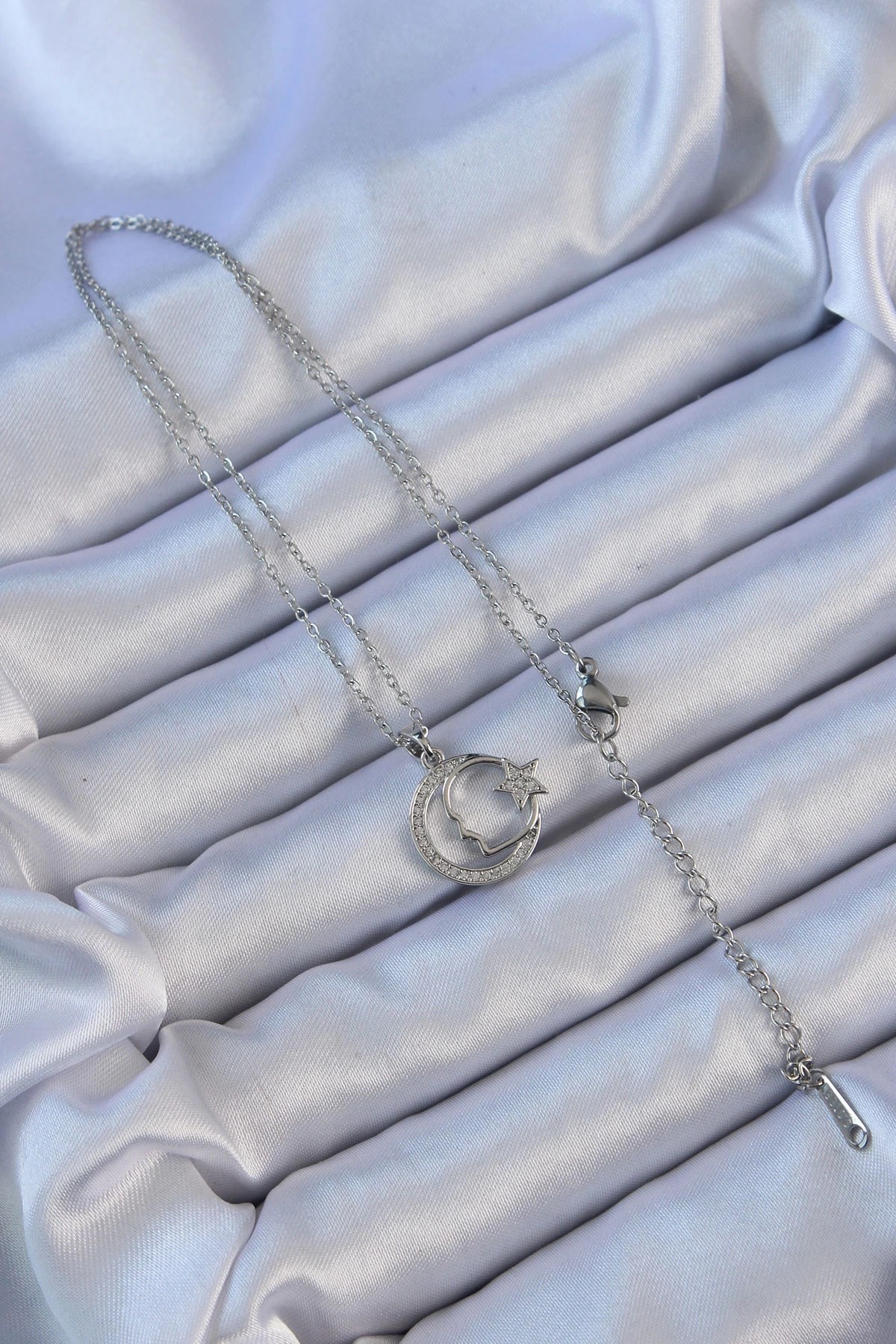 Mey İthalat® 316L Çelik Zincir Gümüş Renk Zirkon Taşlı Ay Yıldız Simgeli Atatürk Kolye