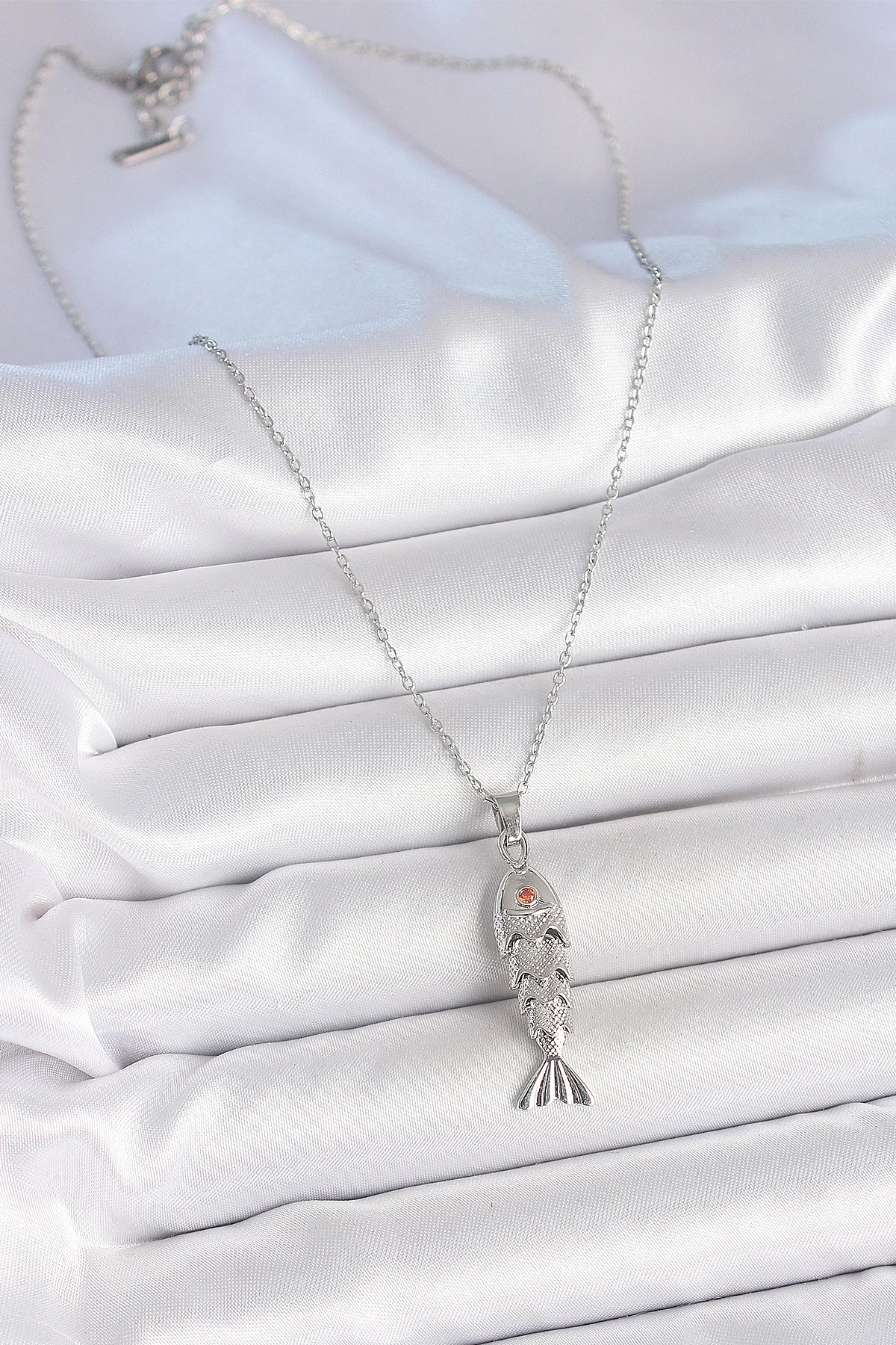 Mey İthalat® 316L Çelik Zincir Gümüş Renk Zirkon Taşlı Balık Figürlü Kolye