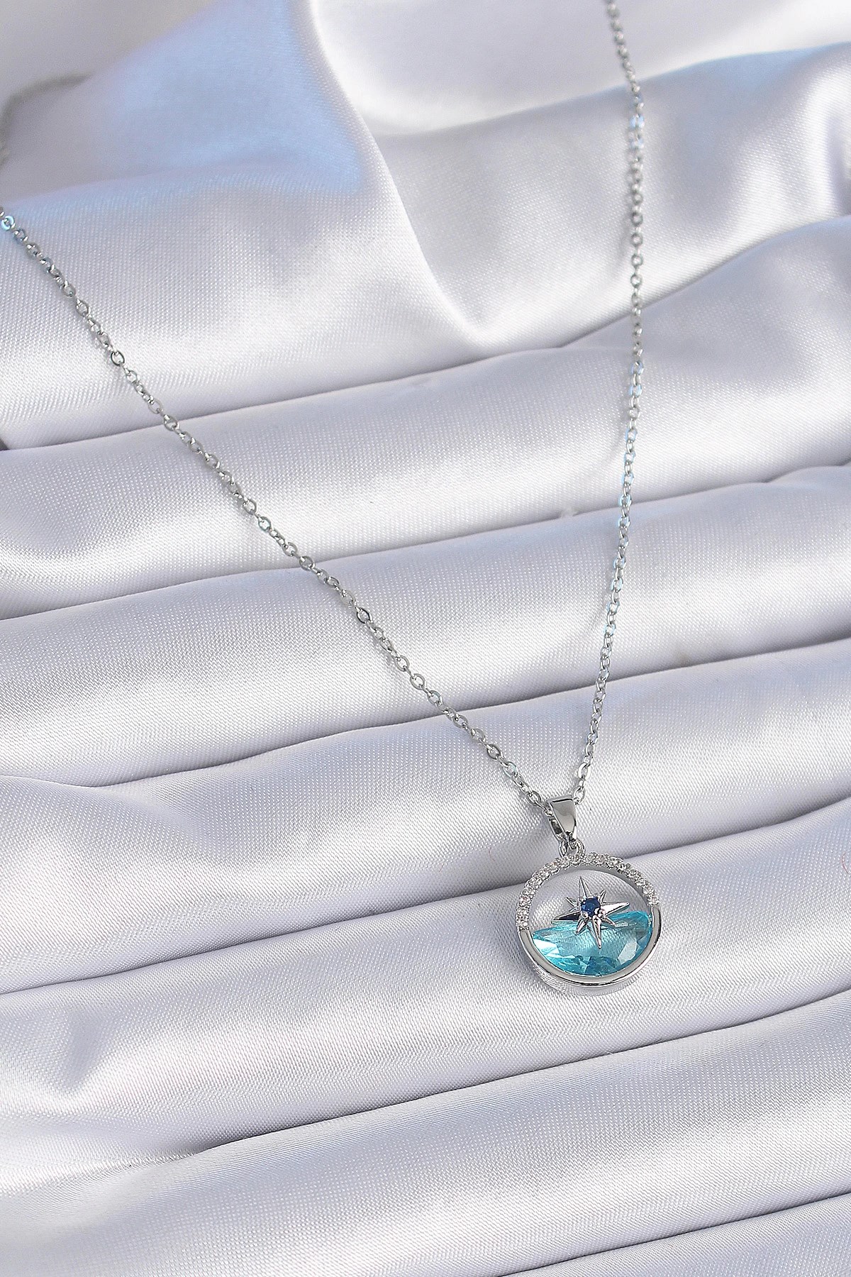 Mey İthalat® 316L Çelik Zincir Gümüş Renk Zirkon Taşlı Deniz Görünüm Kutup Yıldızı Kolye