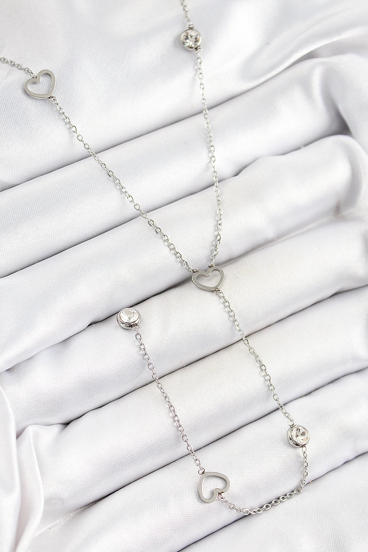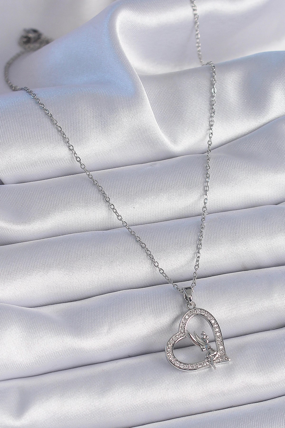 Mey İthalat® 316L Çelik Zincir Gümüş Renk Zirkon Taşlı Kalp Model Melek Detay Kadın Kolye
