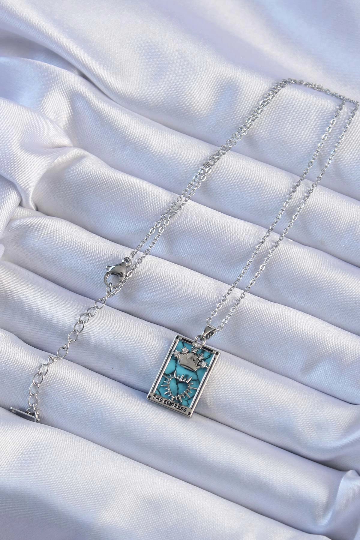 Mey İthalat® 316L Çelik Zincir Gümüş Renk Zirkon Taşlı Mavi Mermer Desenli Taç Model Tarot Kolye