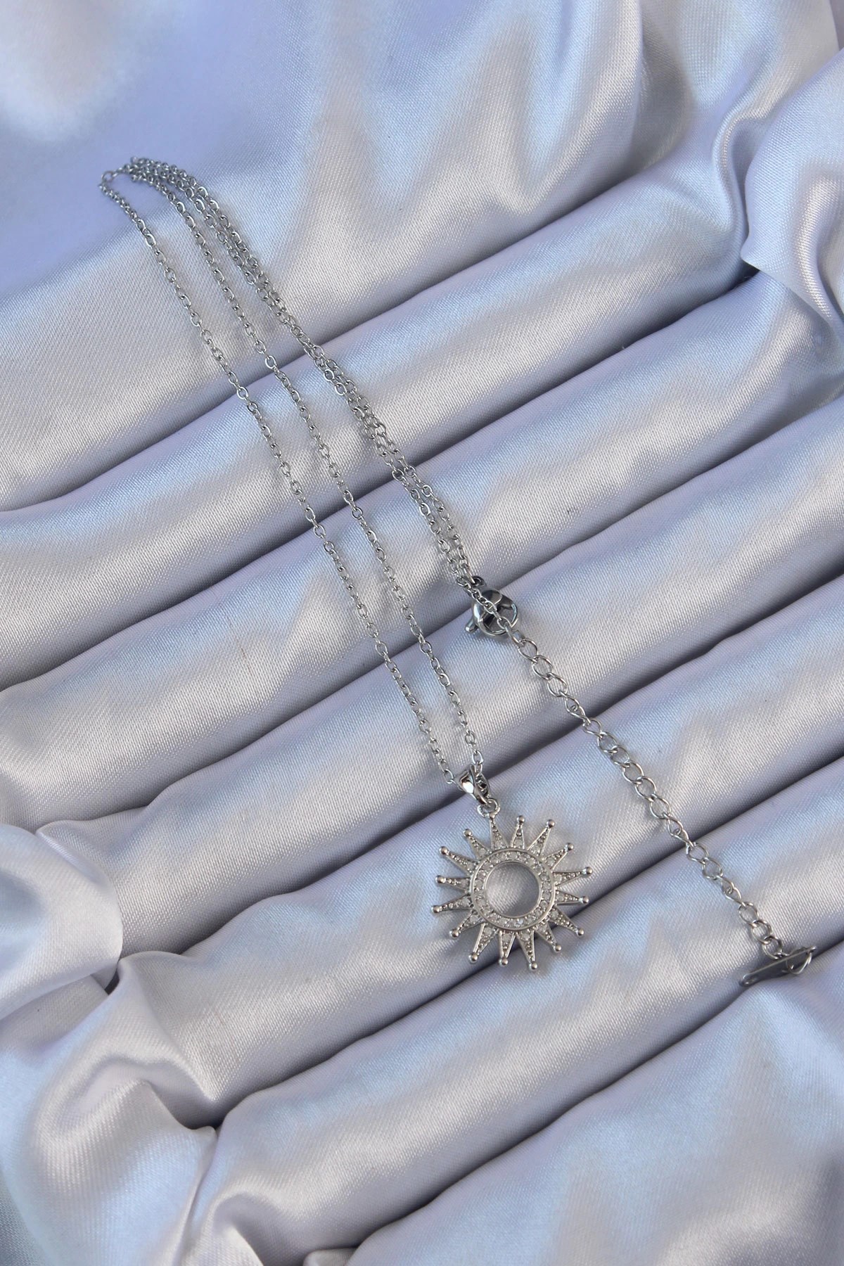 Mey İthalat® 316L Çelik Zincir Gümüş Renk Zirkon Taşlı Parlayan Güneş Kolye