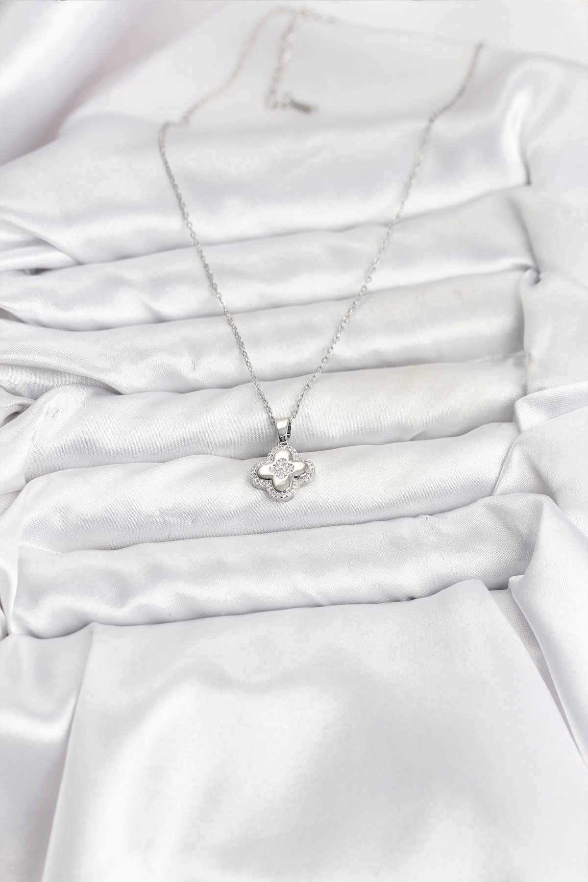 Mey İthalat® 316L Çelik Zincir Gümüş Renk Zirkon Taşlı Yonca Model Kadın Kolye