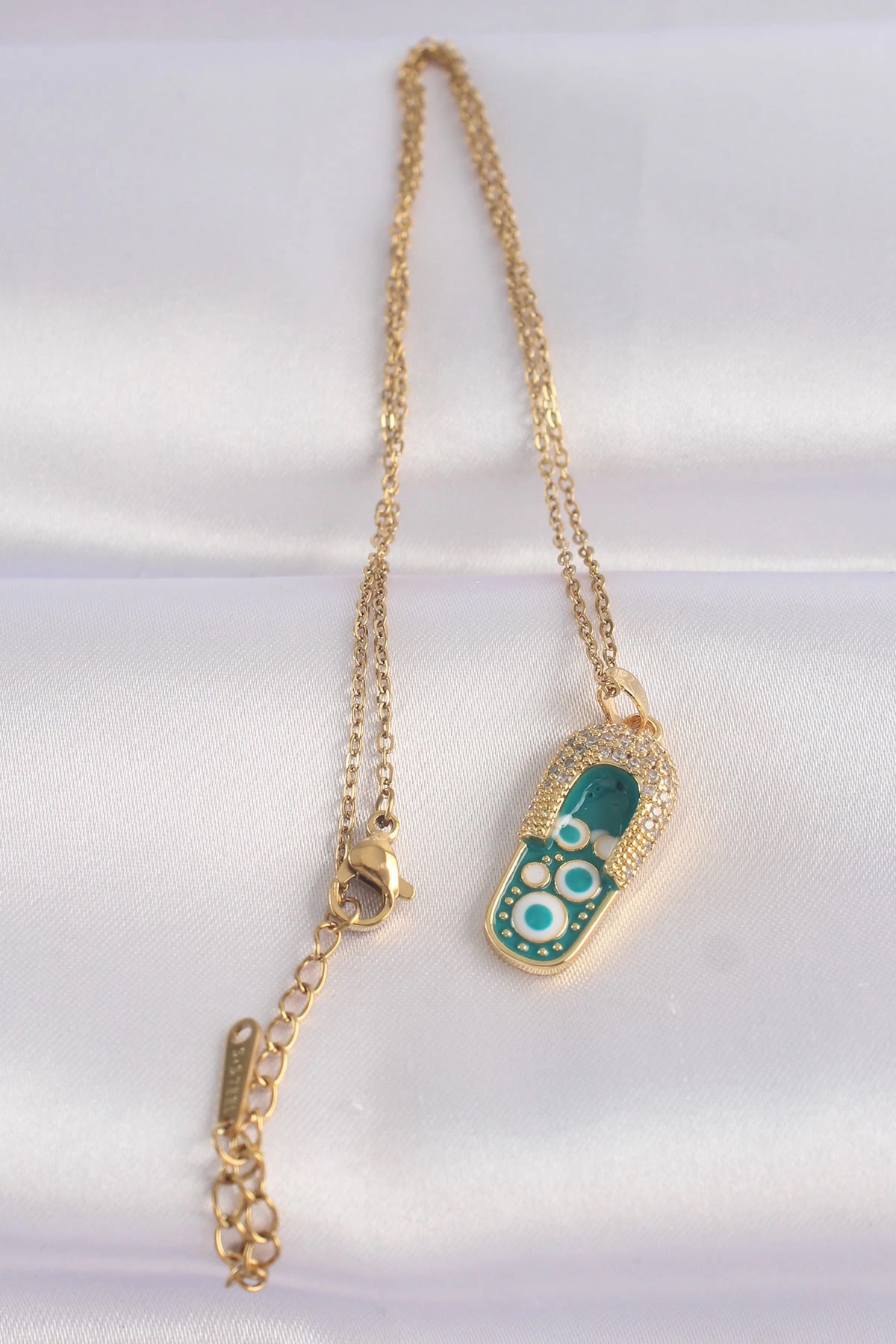 Mey İthalat® 316L Çelik Zincir Zirkon Taşlı Altın Renk Nazarlı Terlik Tasarımlı Kolye