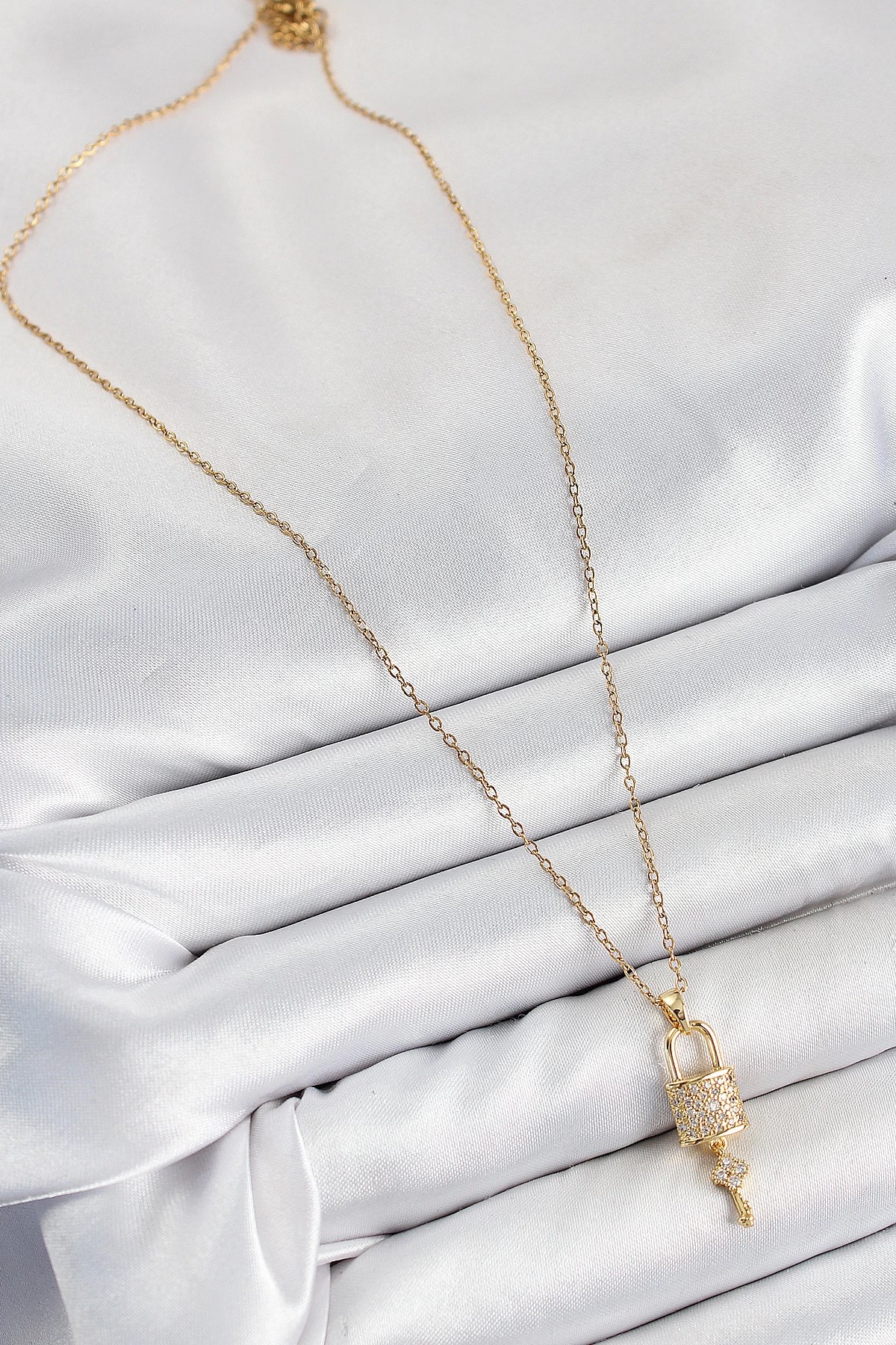 Mey İthalat® 316L Çelik Zirkon Taşlı Kilit Ve Sallantılı Anahtar Model Gold Renk Kadın Kolye