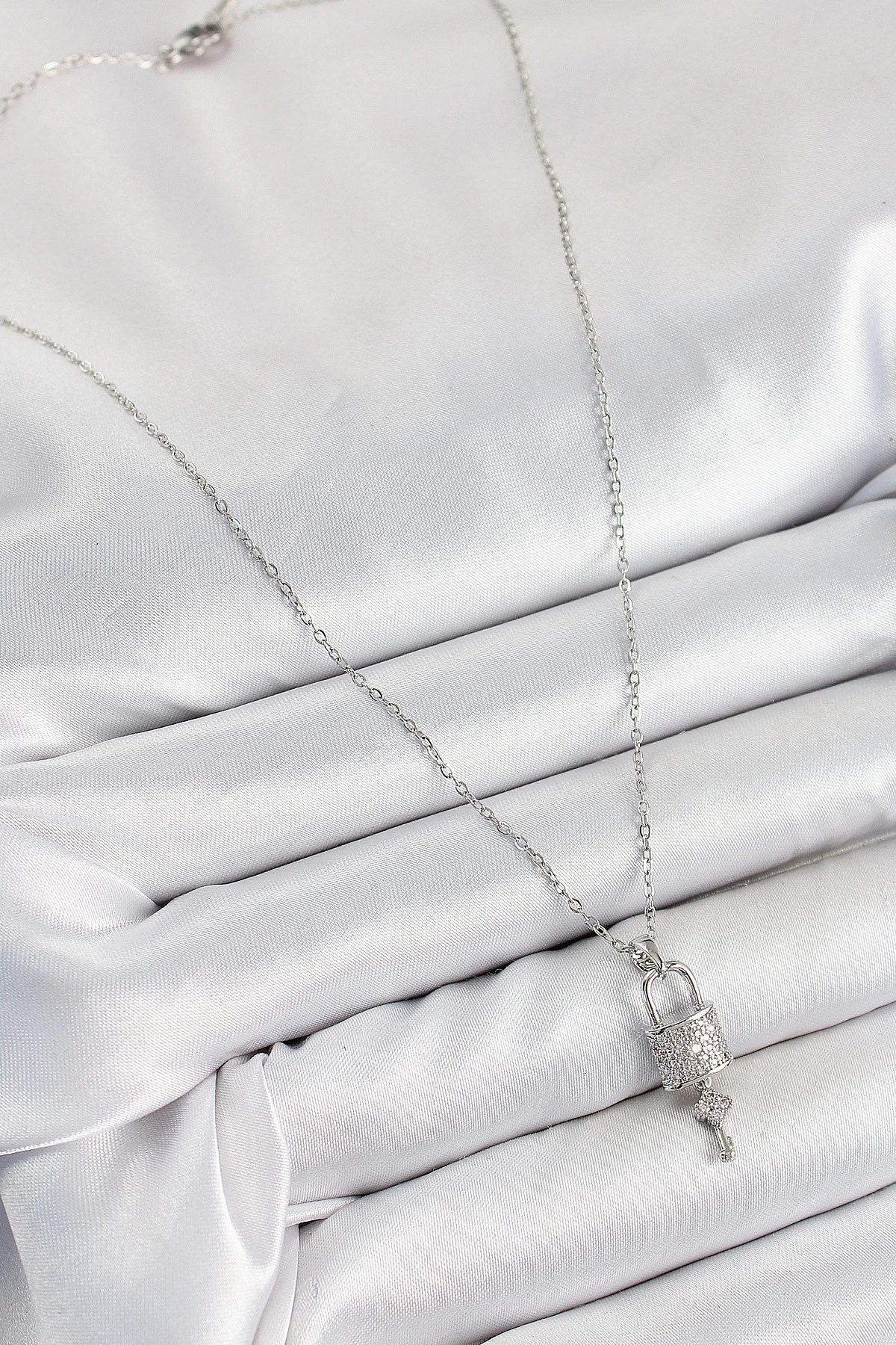 Mey İthalat® 316L Çelik Zirkon Taşlı Kilit Ve Sallantılı Anahtar Model Gümüş Renk Kadın Kolye