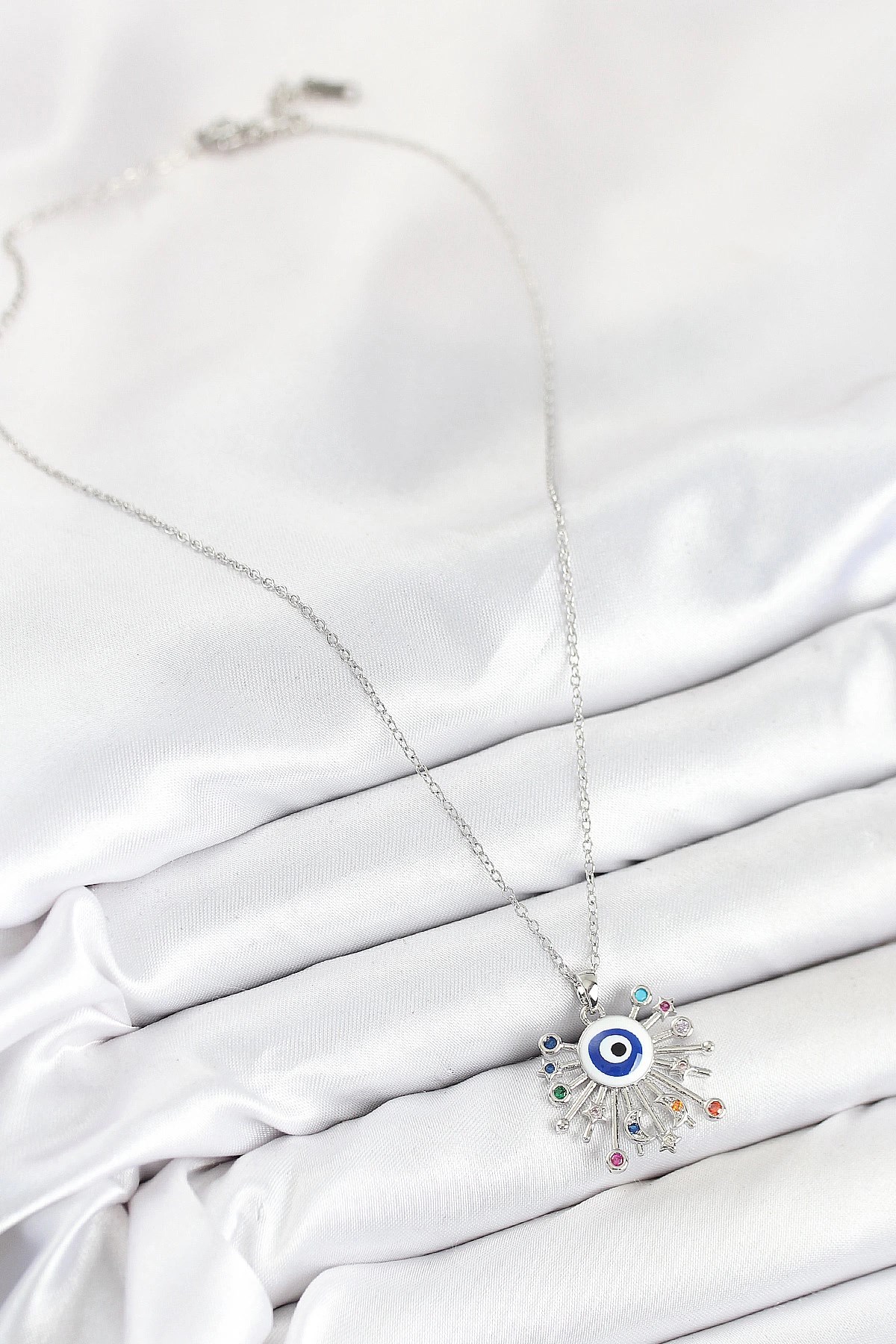 Mey İthalat® 316L Çelik Zirkon Taşlı Nazar Model Gümüş Renk Kadın Kolye