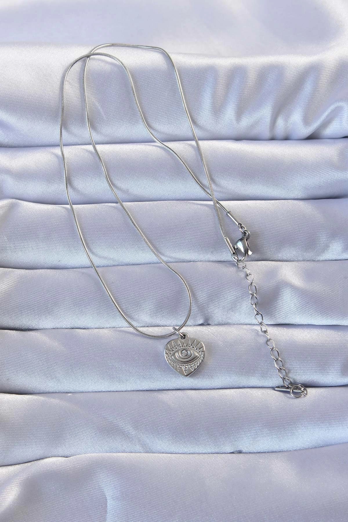 Mey İthalat® 316L Gümüş Renk Zirkon Taşlı İşlemeli Göz Detay Kalp Kolye