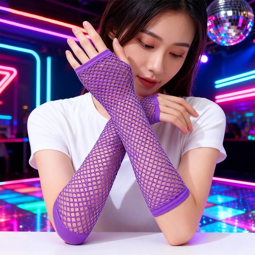 80’ler 90’lar Retro Mor File Uzun Eldiven, neon renkli file dokusuyla retro disco ve pop kültürünün enerjisini stilinize taşır. Esnek yapısı sayesinde kola rahatça oturur ve uzun formu ile sahne, parti ve kostüm kombinlerinde dikkat çekici bir görünüm sunar.