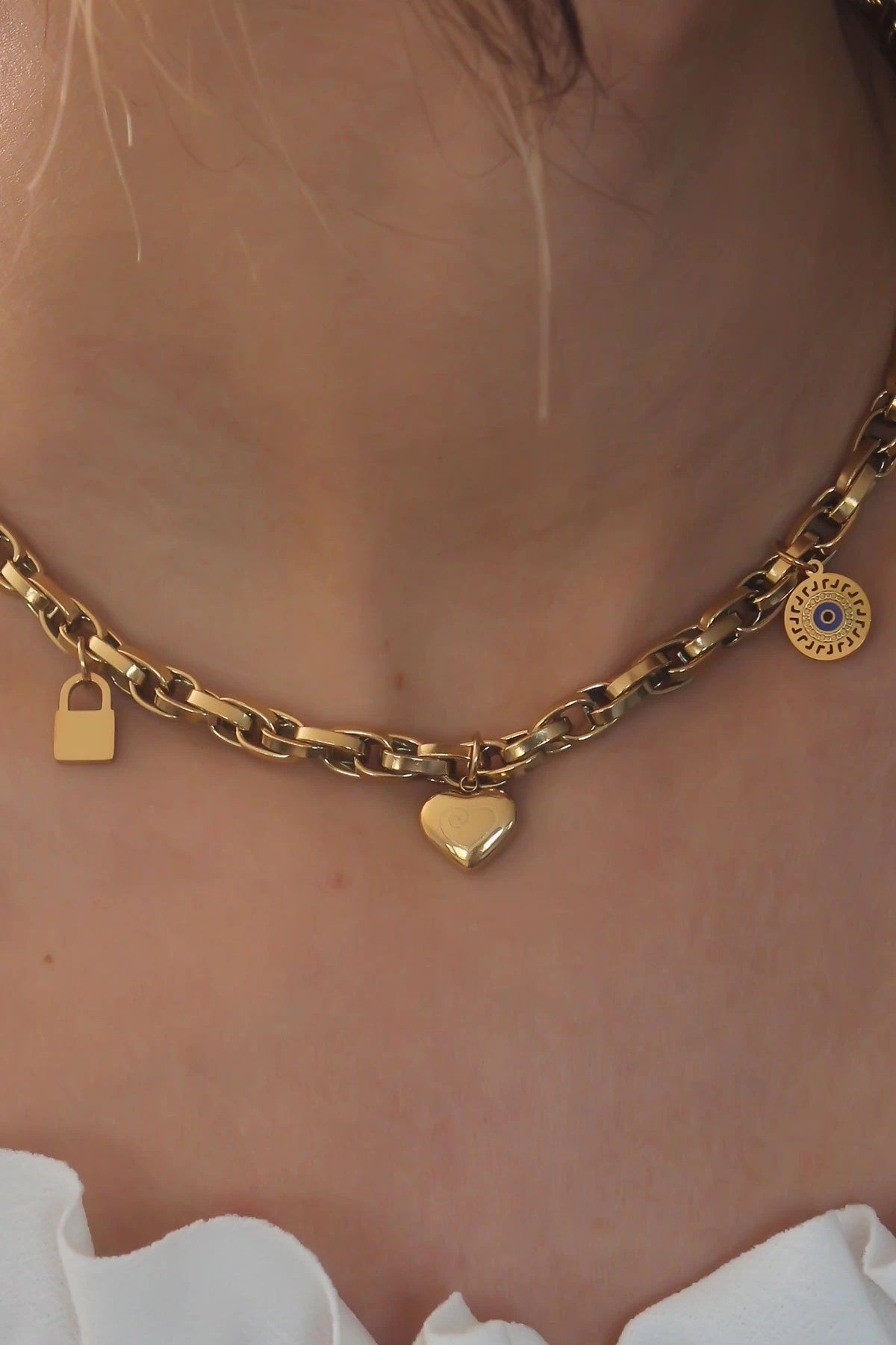 Mey İthalat® Çelik Gold Renk Kalın Zincir Model Kalp Figür Kadın Kolye