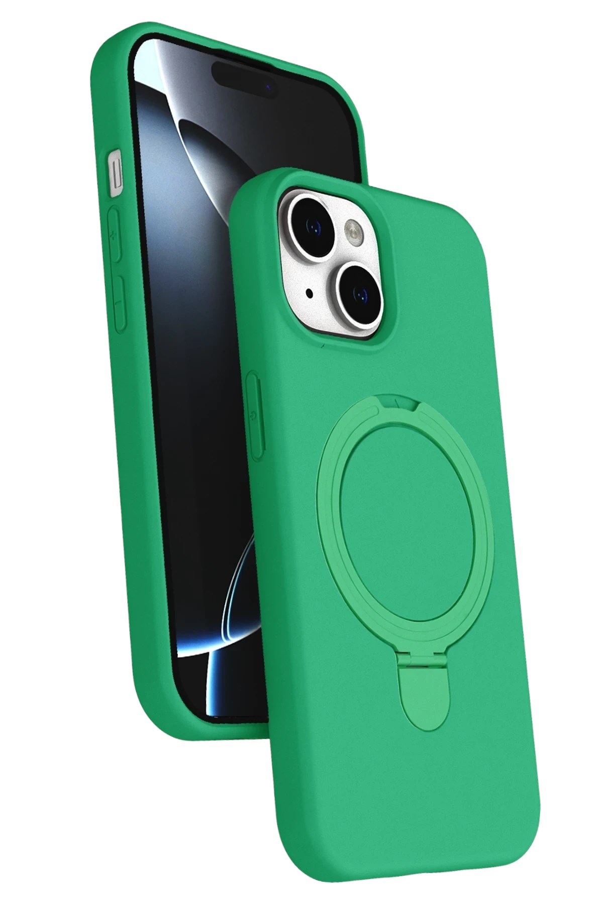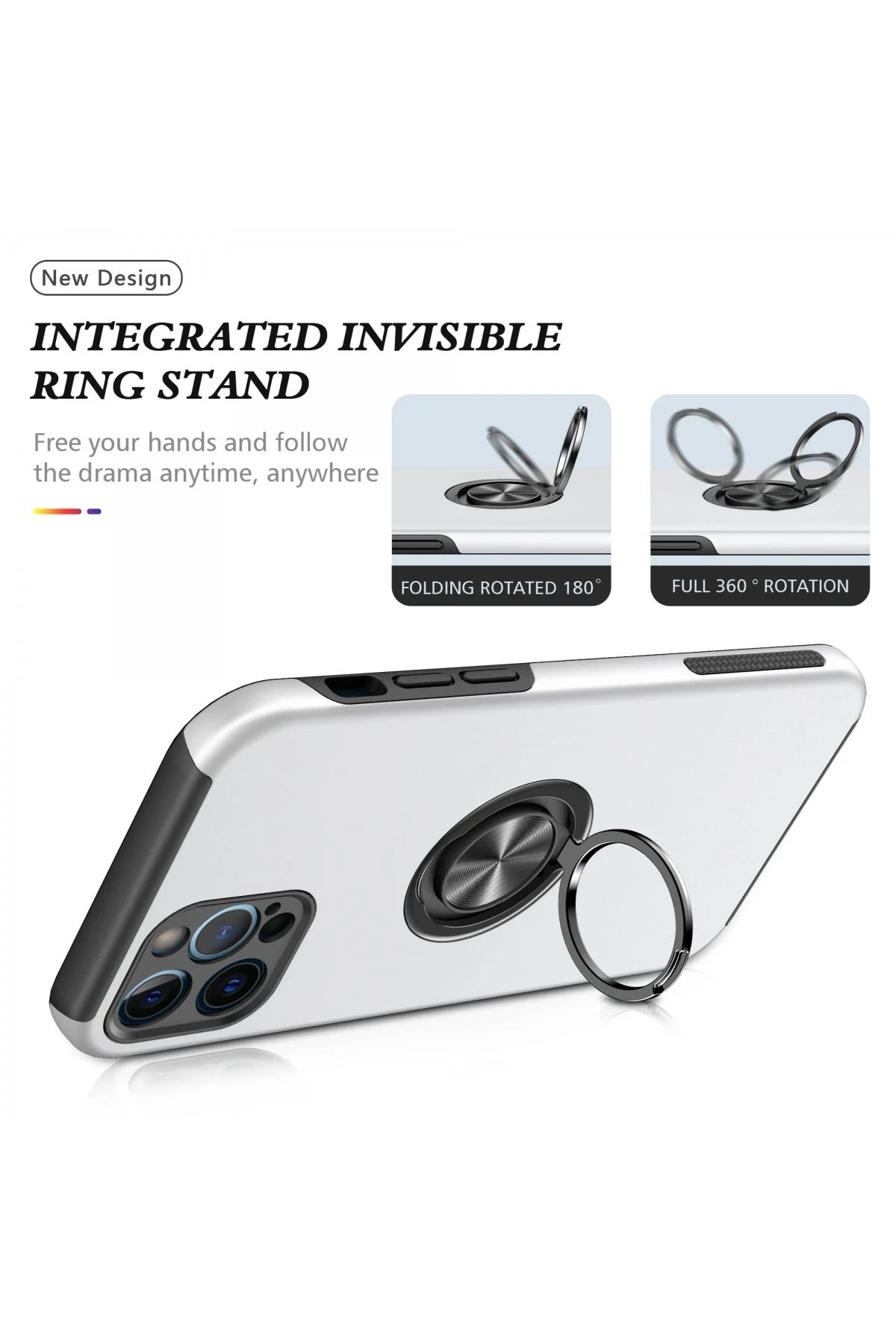 Kapak üzerinde yer alan 360° dönebilen silindir metal yüzük, hem stand işlevi görür hem de mıknatıs özelliği sayesinde araç içi manyetik telefon tutucularla tam uyum sağlar.