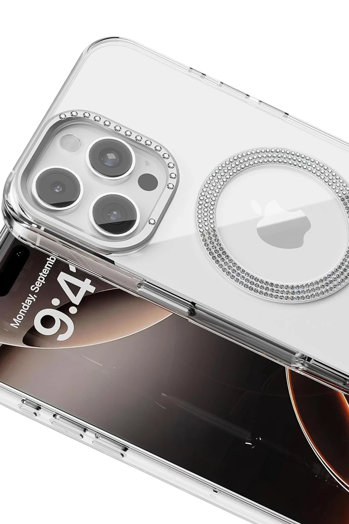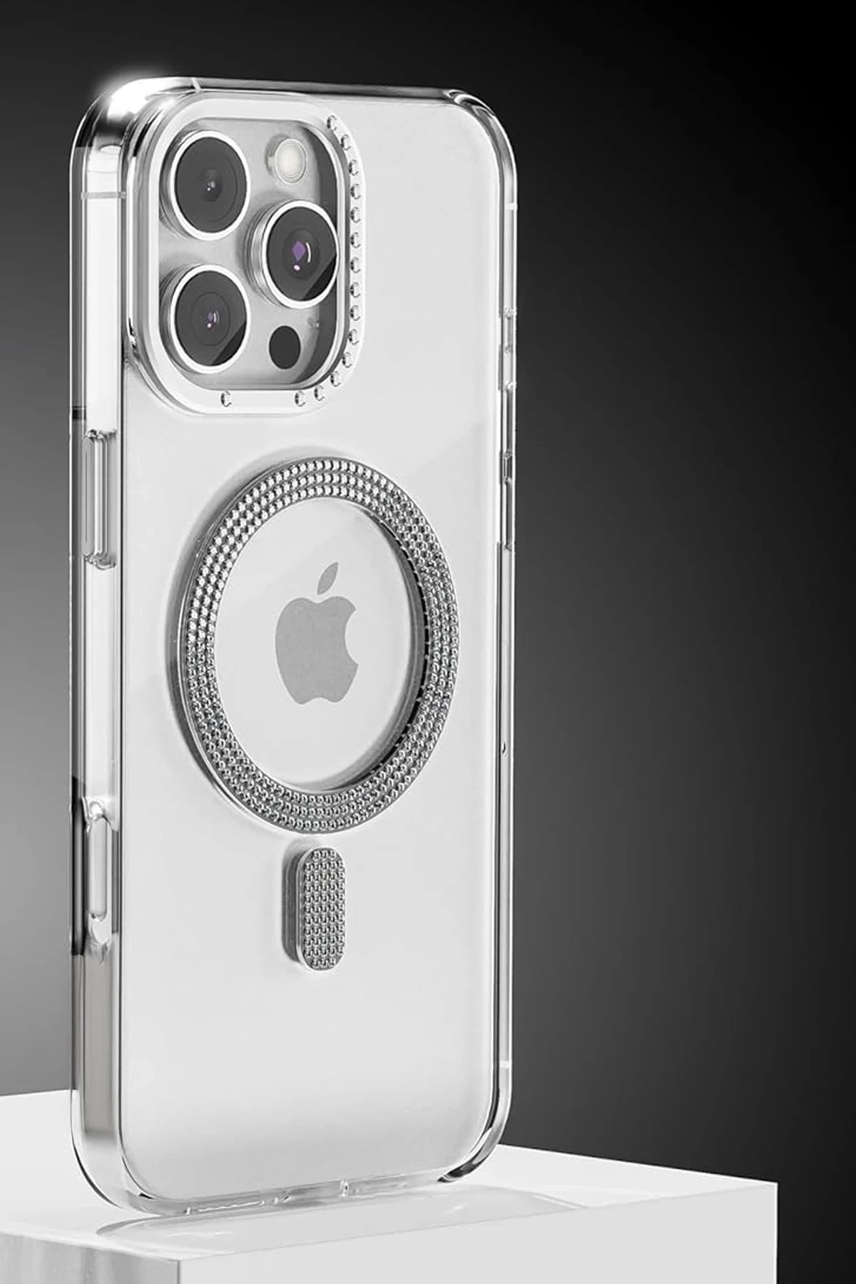 Parlak kristal taşlarla süslenmiş MagSafe halkası; manyetik şarj cihazları, standlar ve MagSafe aksesuarlarla güçlü ve stabil bir uyum sunar.