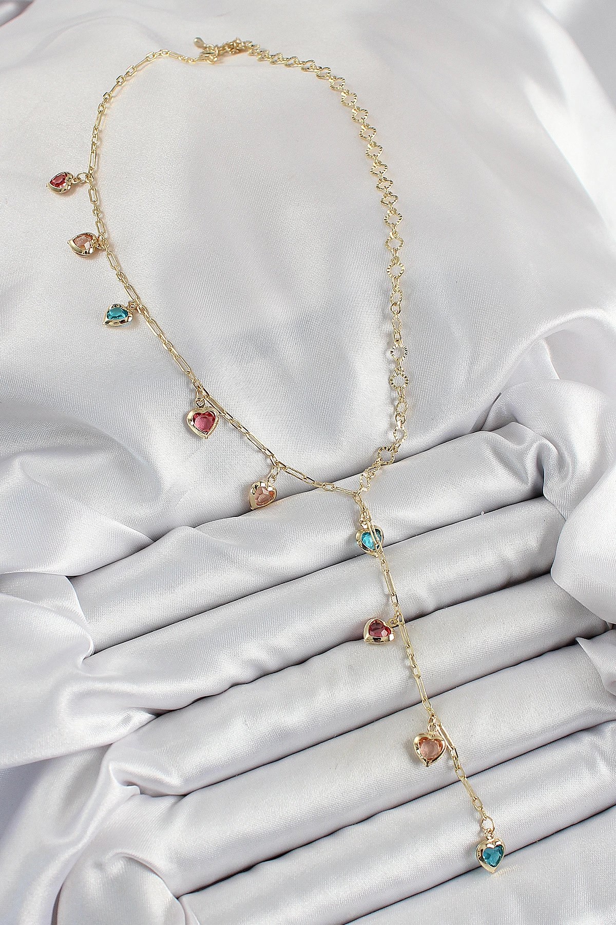 Mey İthalat® Pirinç Asorti Kalp Model Gold Renk Zirkon Taşlı Y Kolye