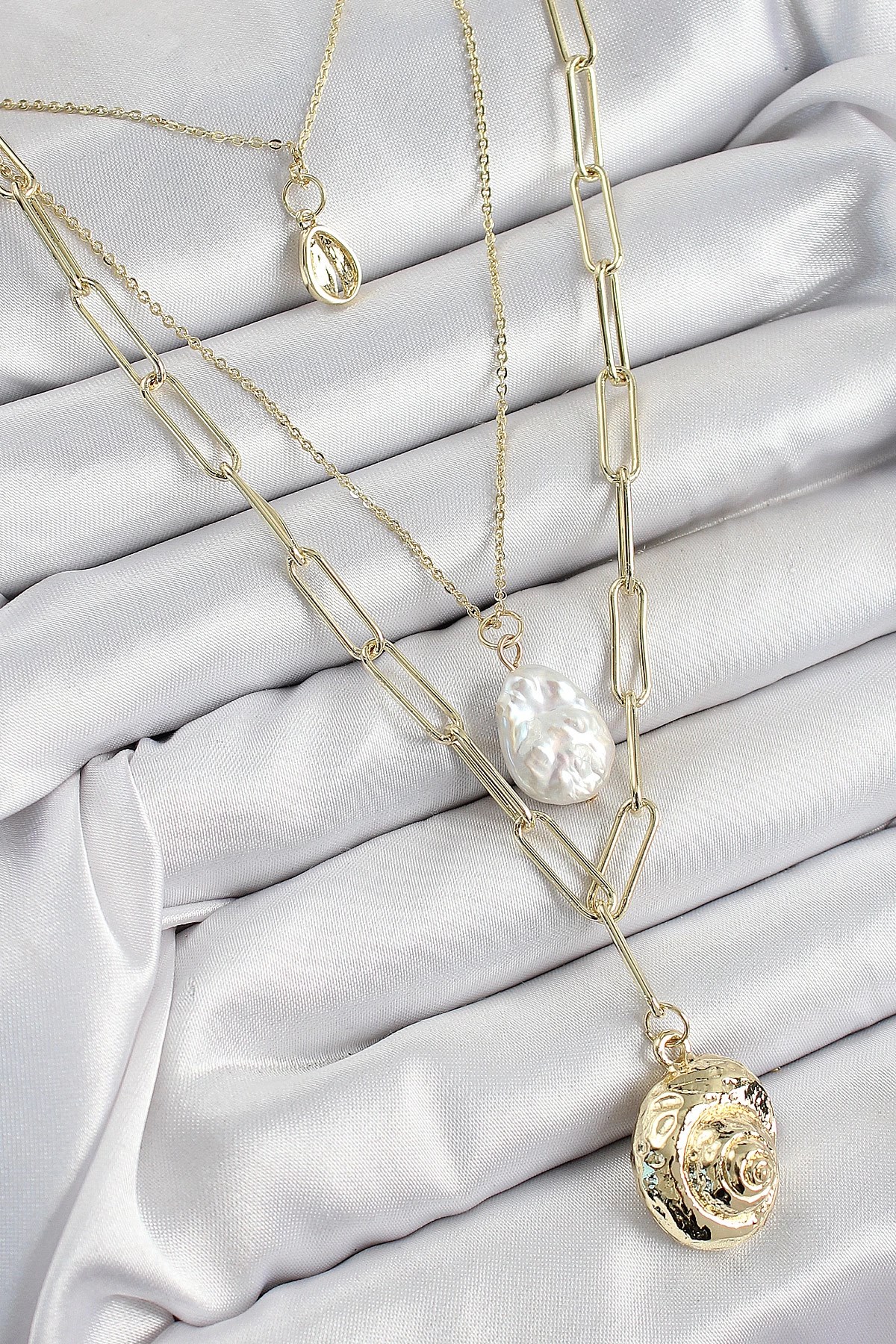 Mey İthalat® Pirinç Çoklu Zincirli İncili Deniz Kabuğu Model Gold Renk Kadın Kolye