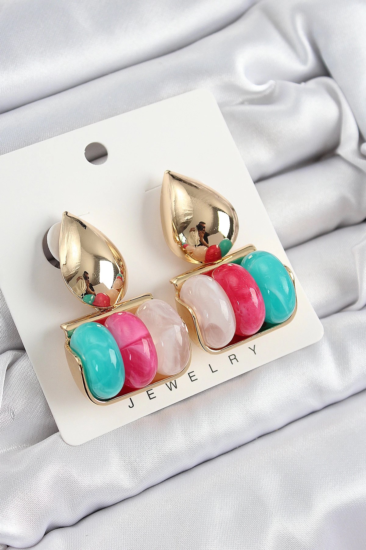 Mey İthalat® Pirinç Gold Renk Topçuk Model Mineli Halka Kadın Küpe