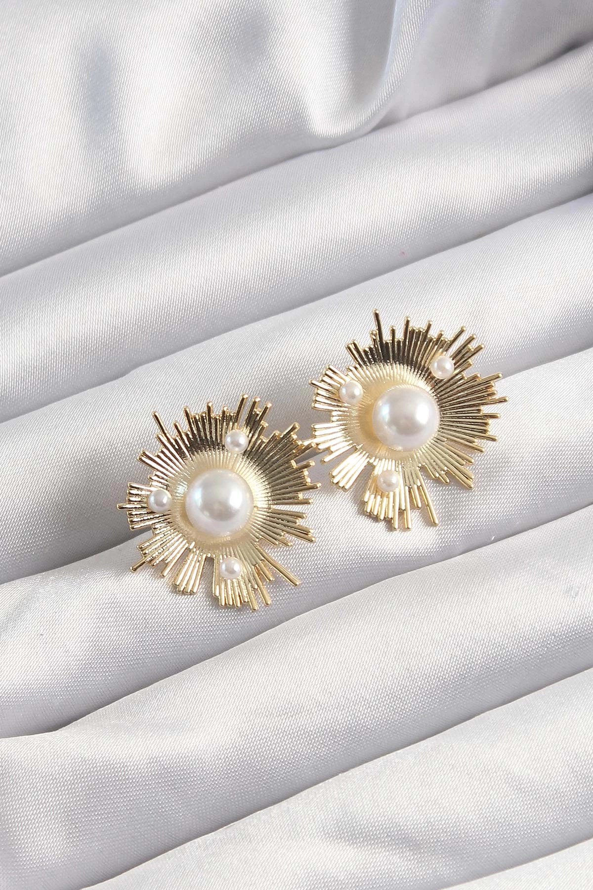 Mey İthalat® Pirinç Gold Renk Zirkon Taşlı Parlayan İnci Taneleri Küpe
