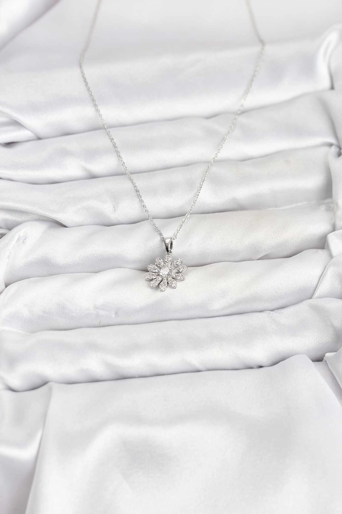 Mey İthalat® Pirinç Gümüş Renk Çiçek Model Kadın Kolye