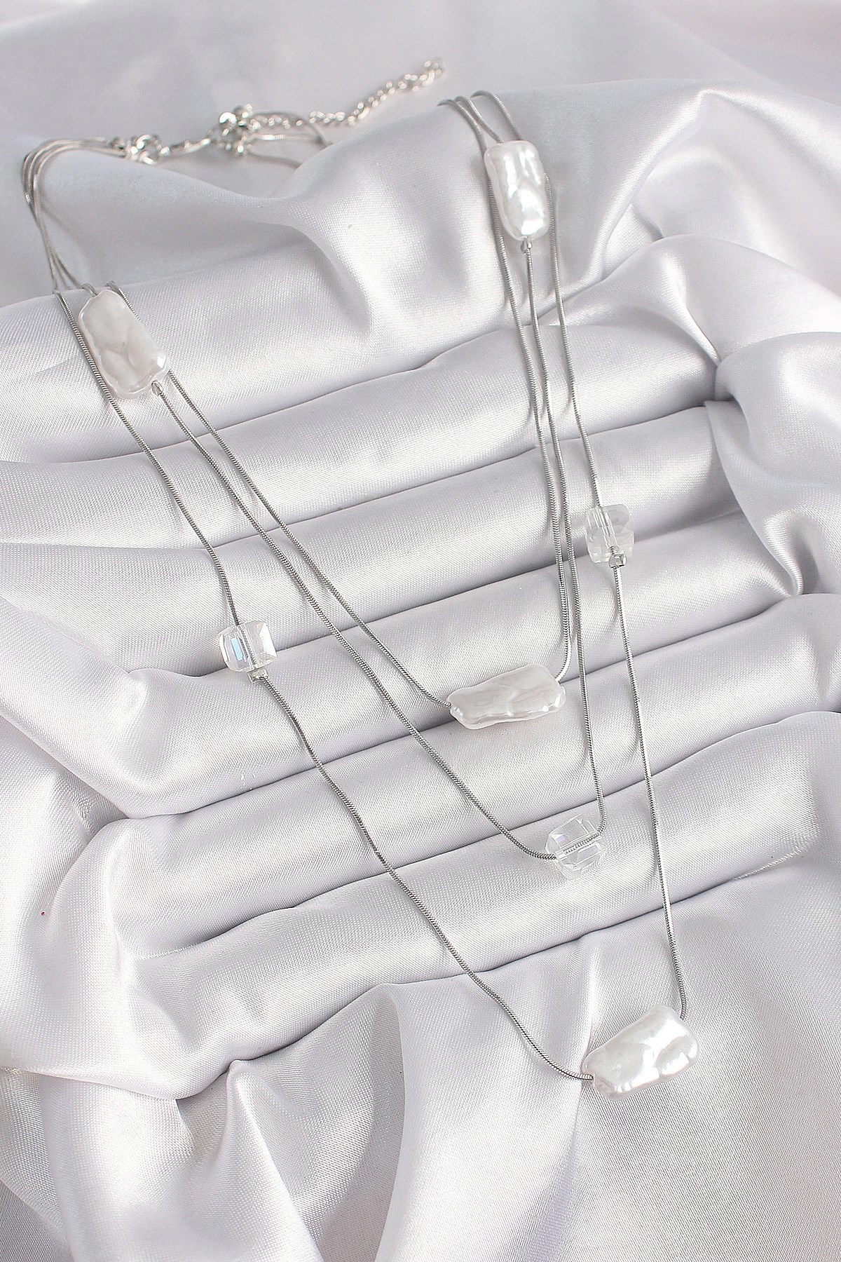 Mey İthalat® Pirinç Gümüş Renk Ezme İnci Model Çoklu Kadın Kolye