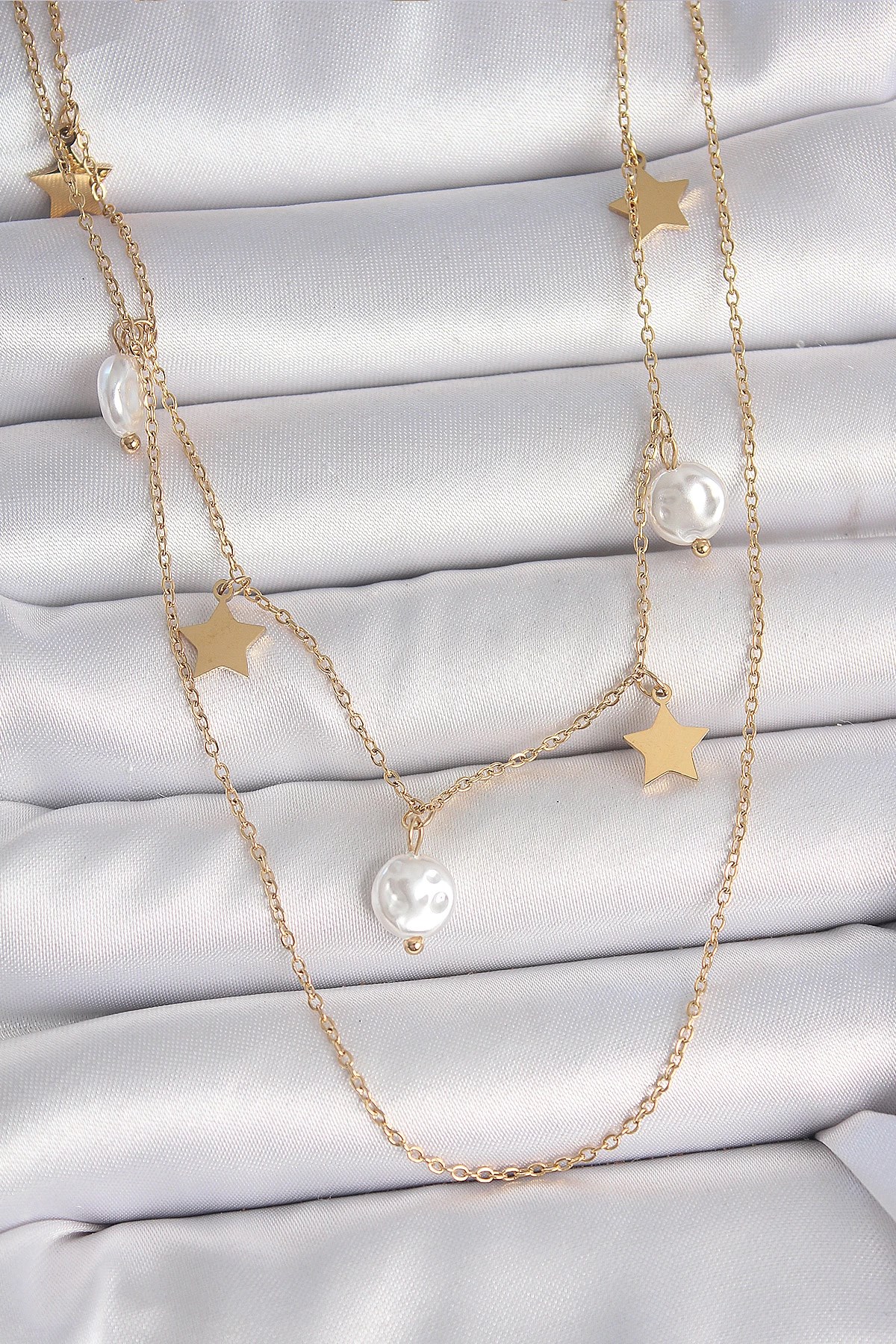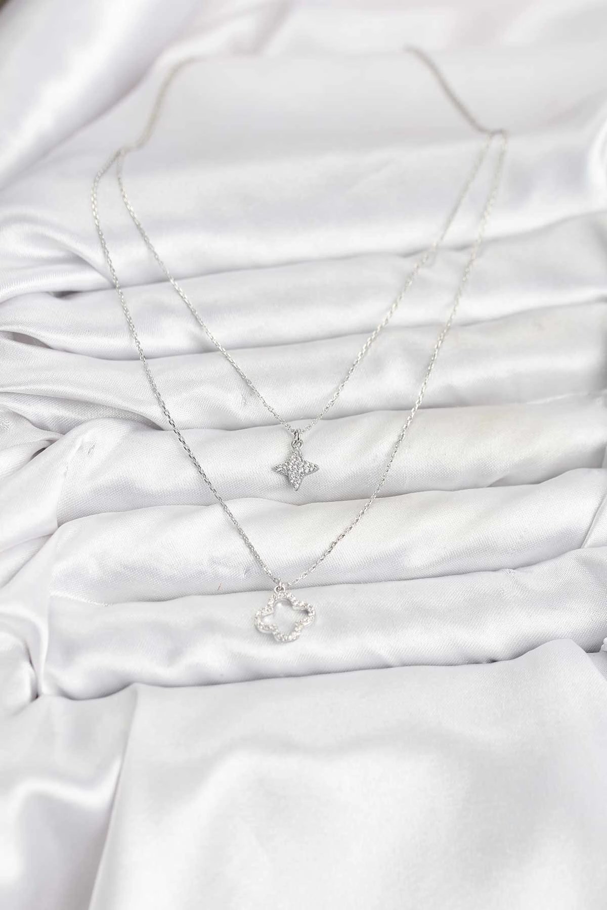 Mey İthalat® Pirinç Gümüş Renk Yonca Model 2'li Kadın Kolye