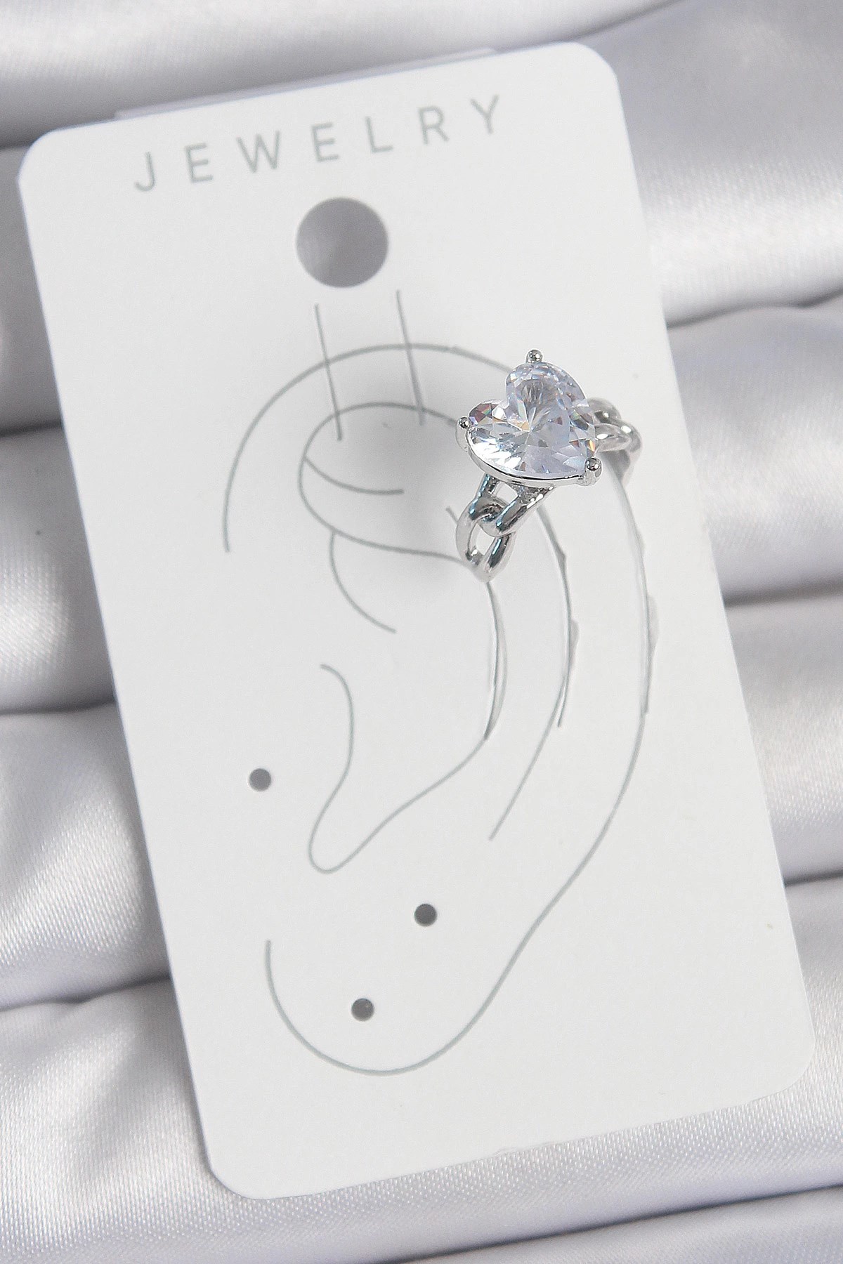 Mey İthalat® Pirinç Gümüş Renk Zirkon Taşlı Kalp Model Kadın Kıkırdak Küpe