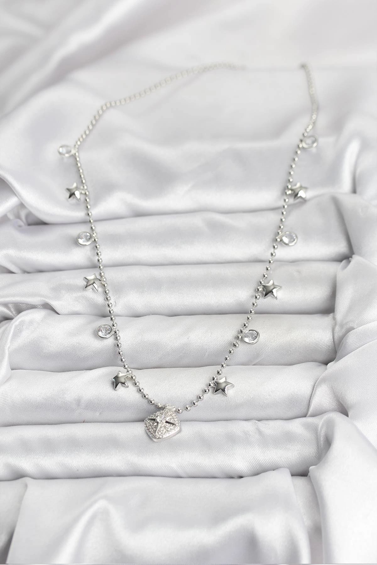 Mey İthalat® Pirinç Gümüş Renk Zirkon Taşlı Kutup Yıldızı Model Kadın Kolye