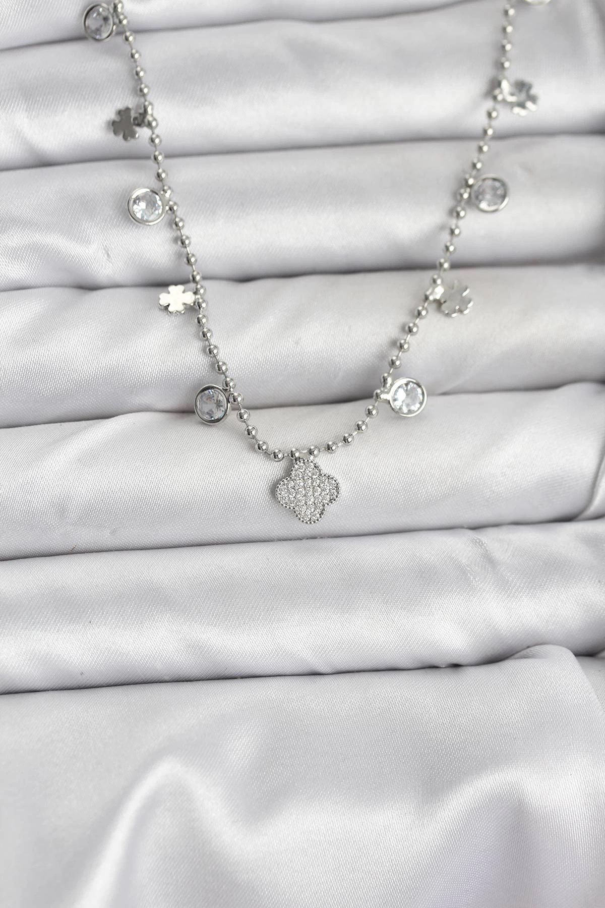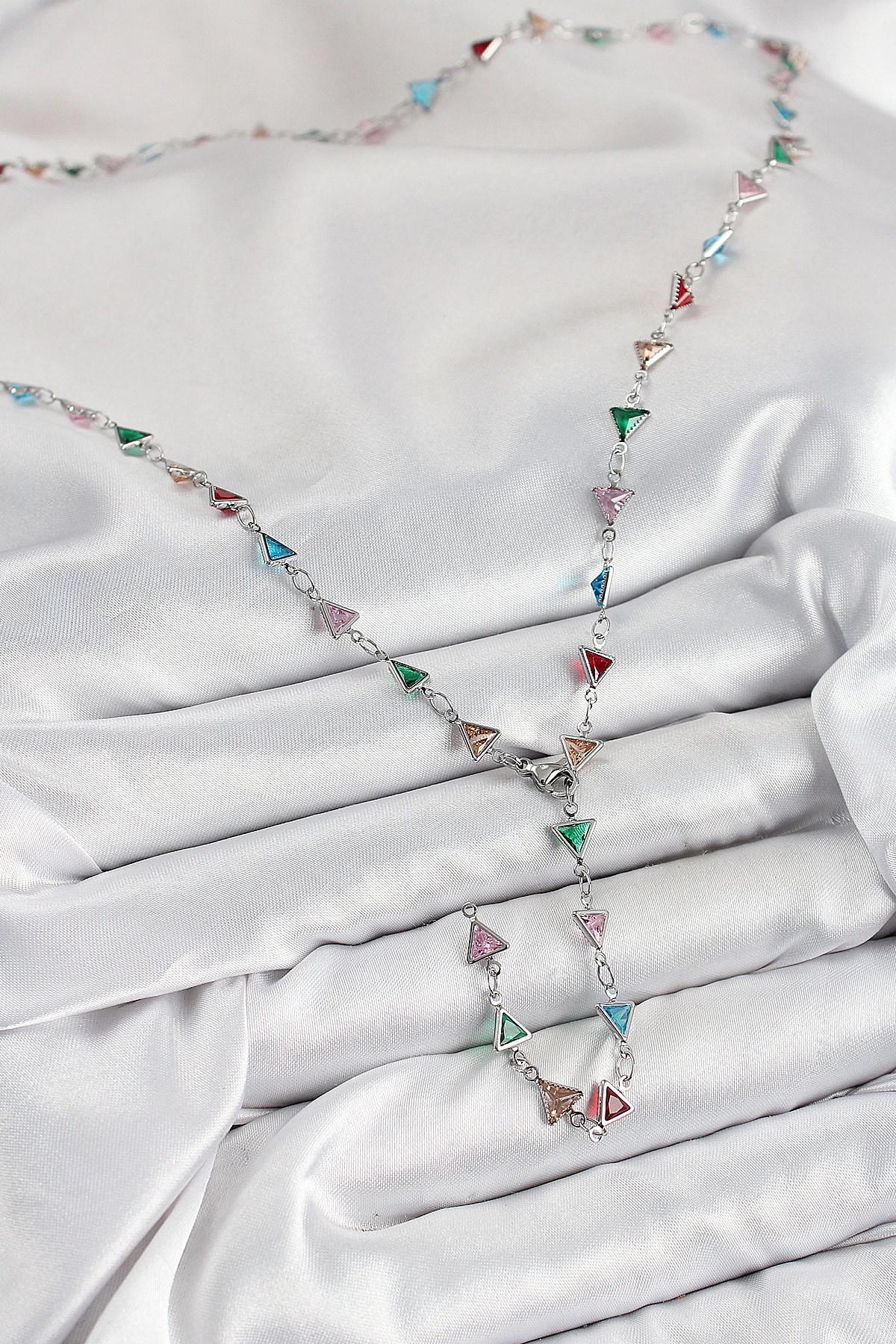 Mey İthalat® Pirinç Renkli Zirkon Taşlı Üçgen Model Gümüş Renk Kadın Y Kolye