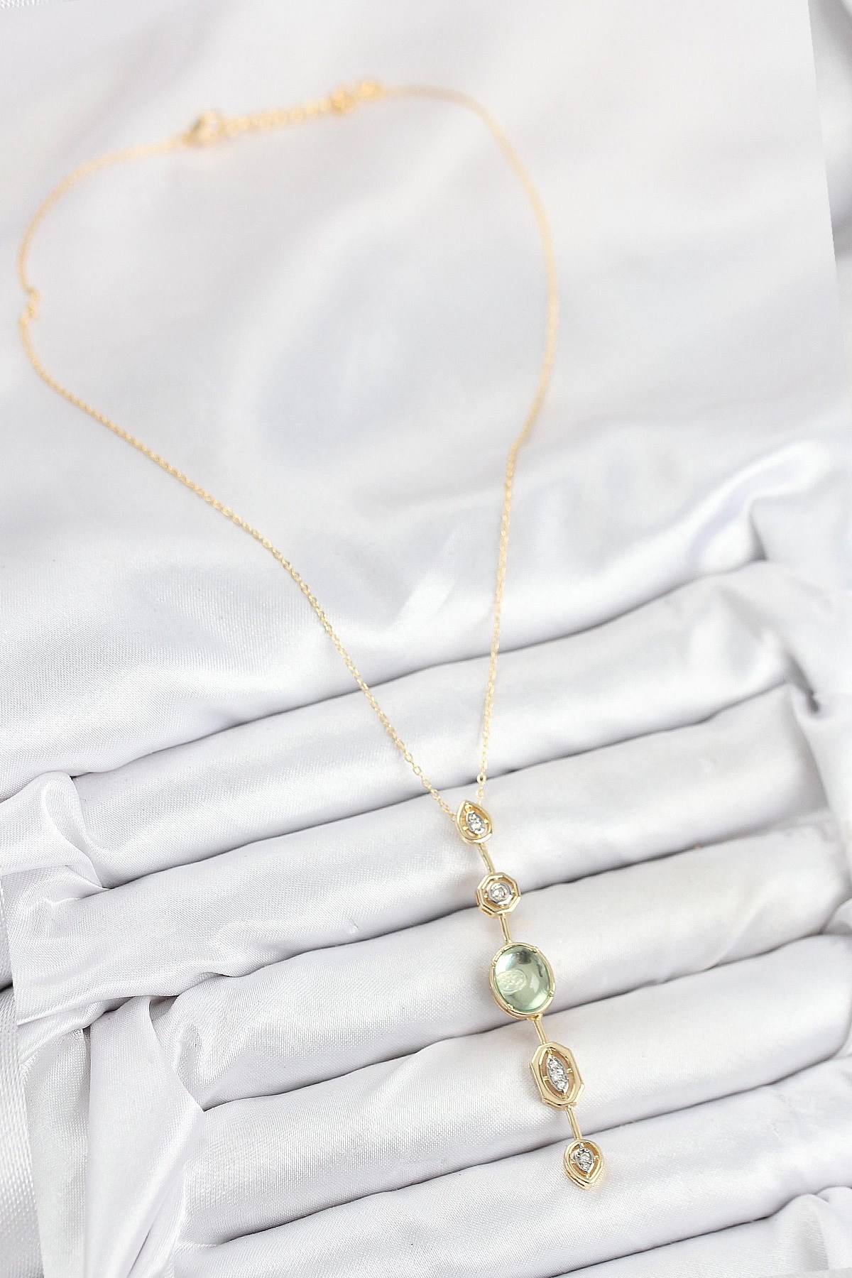 Mey İthalat® Pirinç Zincir Yeşil Gold Renk Zirkon Taşlı Y Kolye