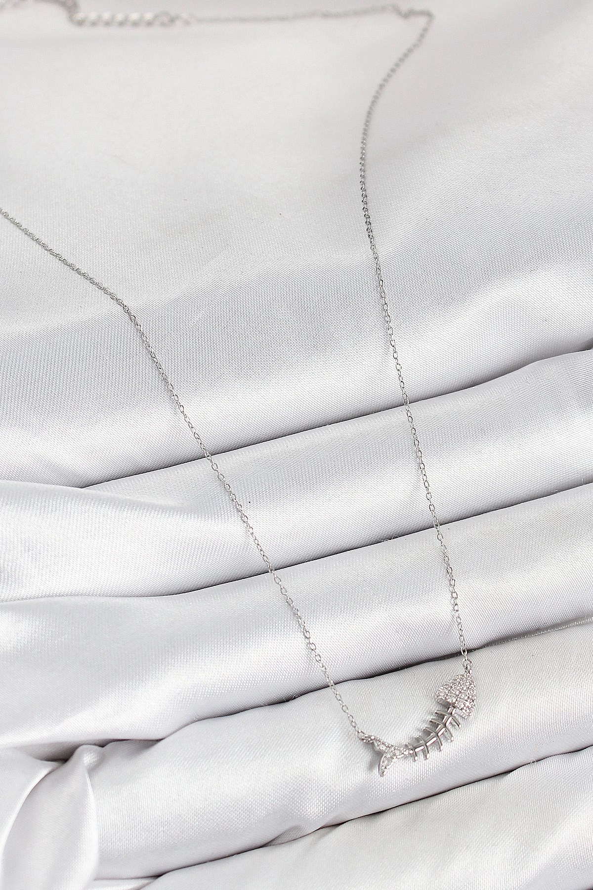 Mey İthalat® Pirinç Zirkon Taşlı Balık Kılçığı Model Gümüş Renk Kadın Kolye