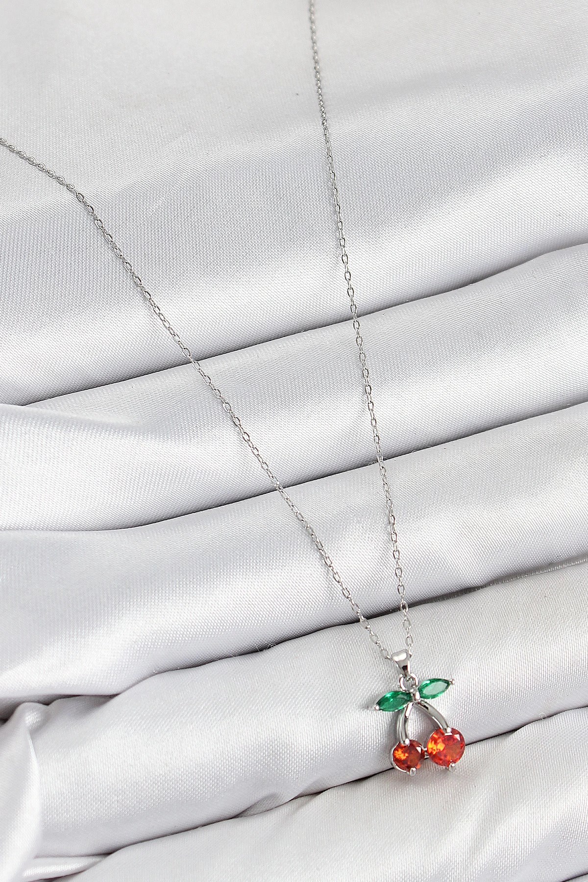 Mey İthalat® Pirinç Zirkon Taşlı Kiraz Model Gümüş Renk Kadın Kolye