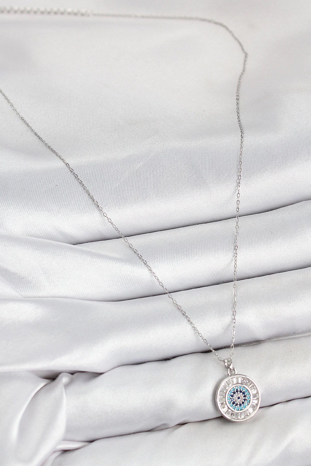 Mey İthalat® Pirinç Zirkon Taşlı Su Yolu Nazar Model Gümüş Renk Kadın Kolye