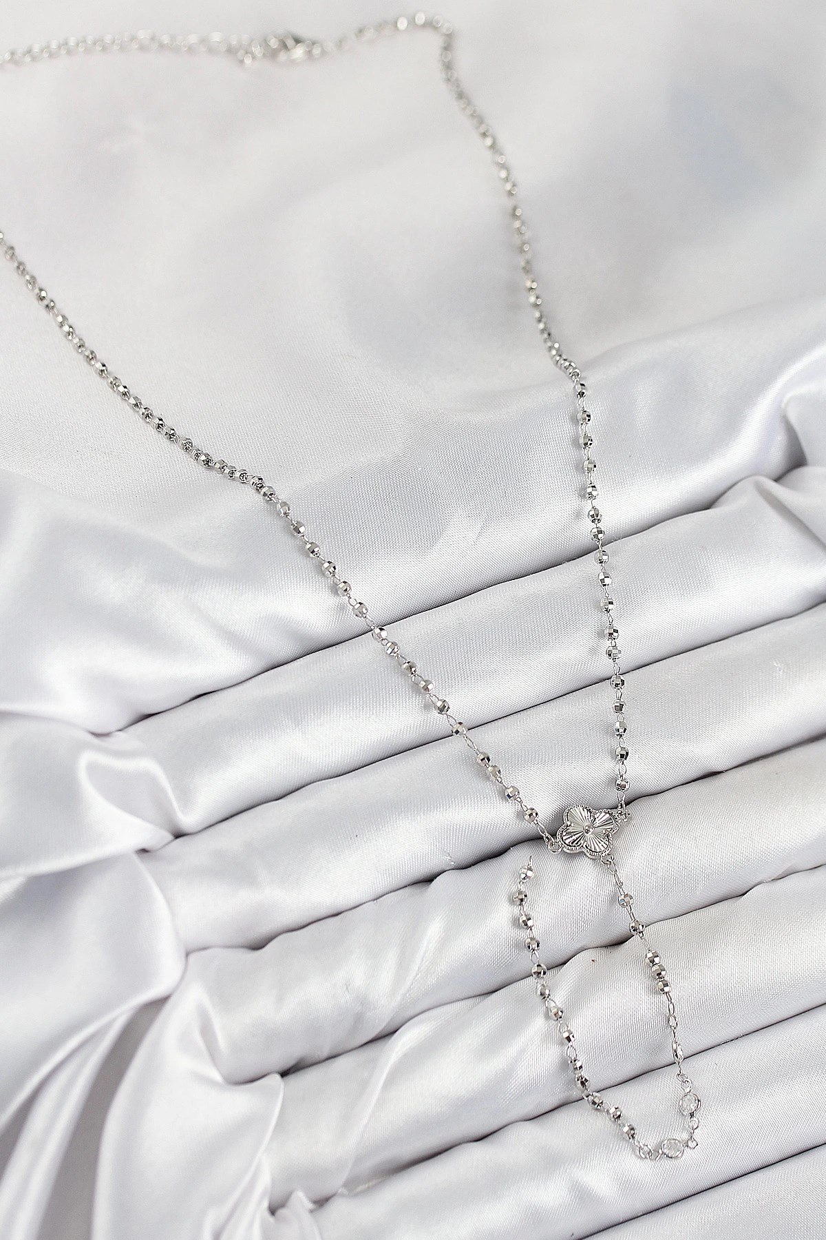 Mey İthalat® Pirinç Zirkon Taşlı Yonca Model Gümüş Renk Kadın Y Kolye
