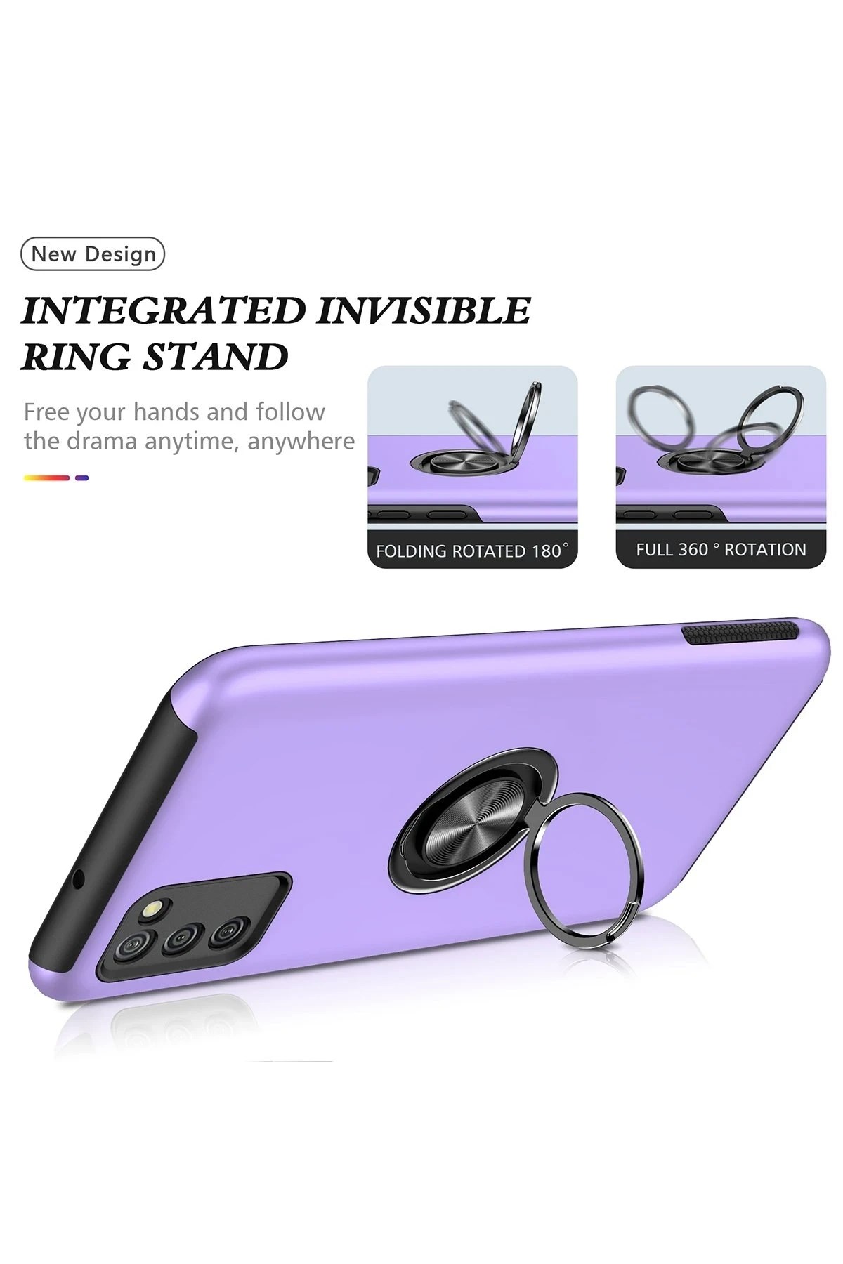 Kapak üzerinde yer alan 360° dönebilen silindir metal yüzük, hem stand işlevi görür hem de mıknatıs özelliği sayesinde araç içi manyetik telefon tutucularla tam uyum sağlar.