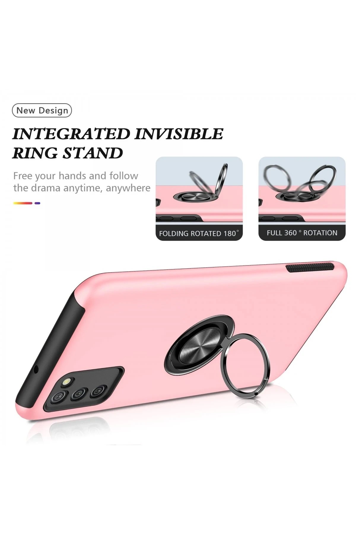 Kapak üzerinde yer alan 360° dönebilen silindir metal yüzük, hem stand işlevi görür hem de mıknatıs özelliği sayesinde araç içi manyetik telefon tutucularla tam uyum sağlar.