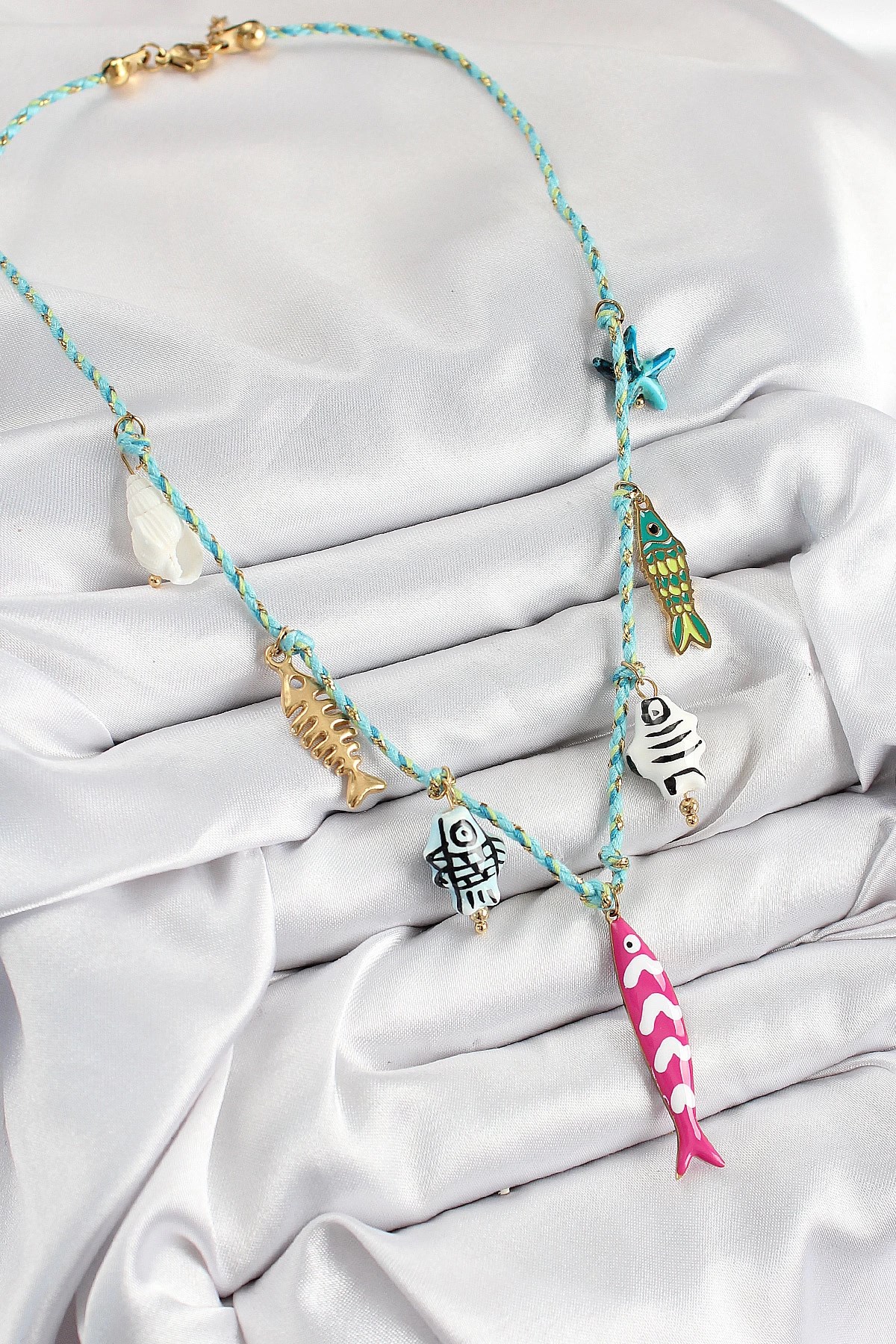 Mey İthalat® Seramik Motifli Pembe Balık Figürlü Model Mavi İp Kadın Kolye