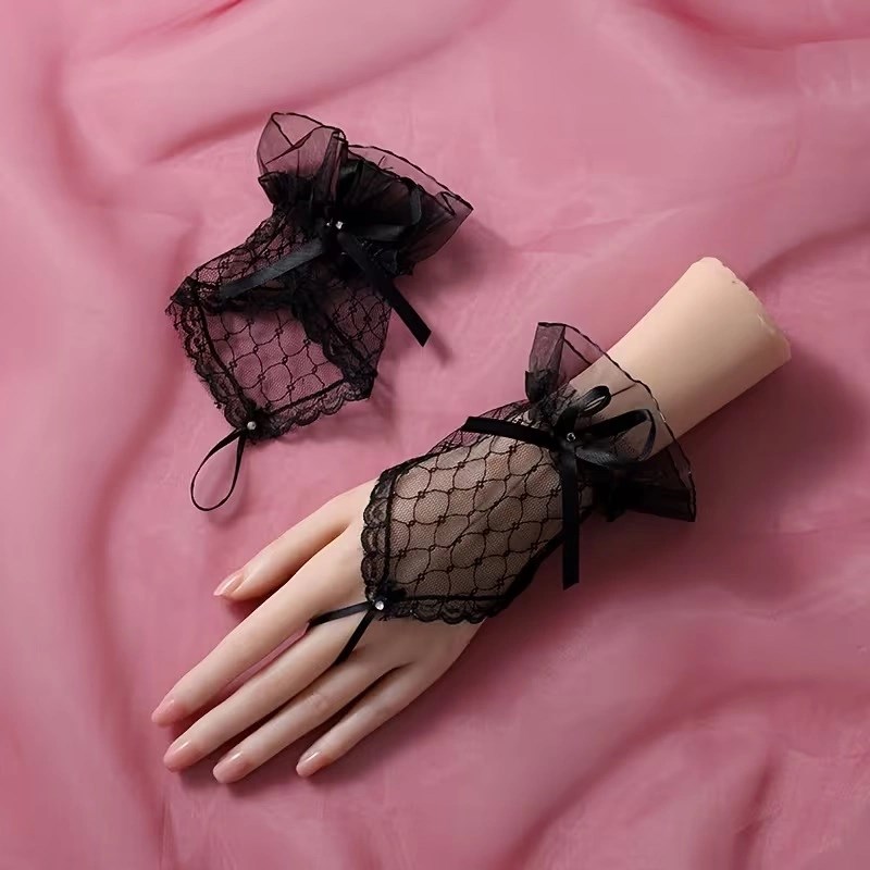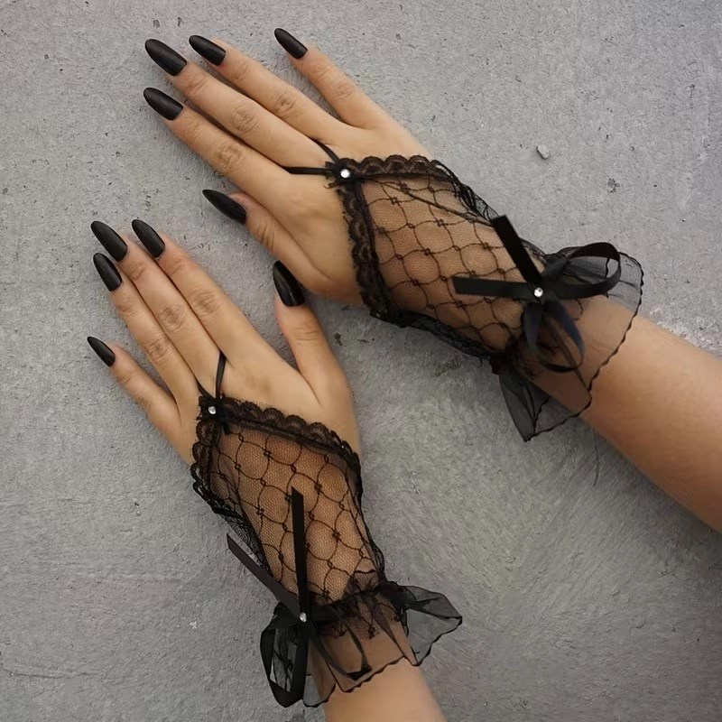 Zarif ve şık tasarımıyla öne çıkan siyah dantel parmak halkalı eldiven, özel günler ve kostüm kombinleri için ideal bir aksesuardır. Üzerindeki dantel dokusu ve dekoratif fiyonk detayı ürüne estetik bir görünüm kazandırır.