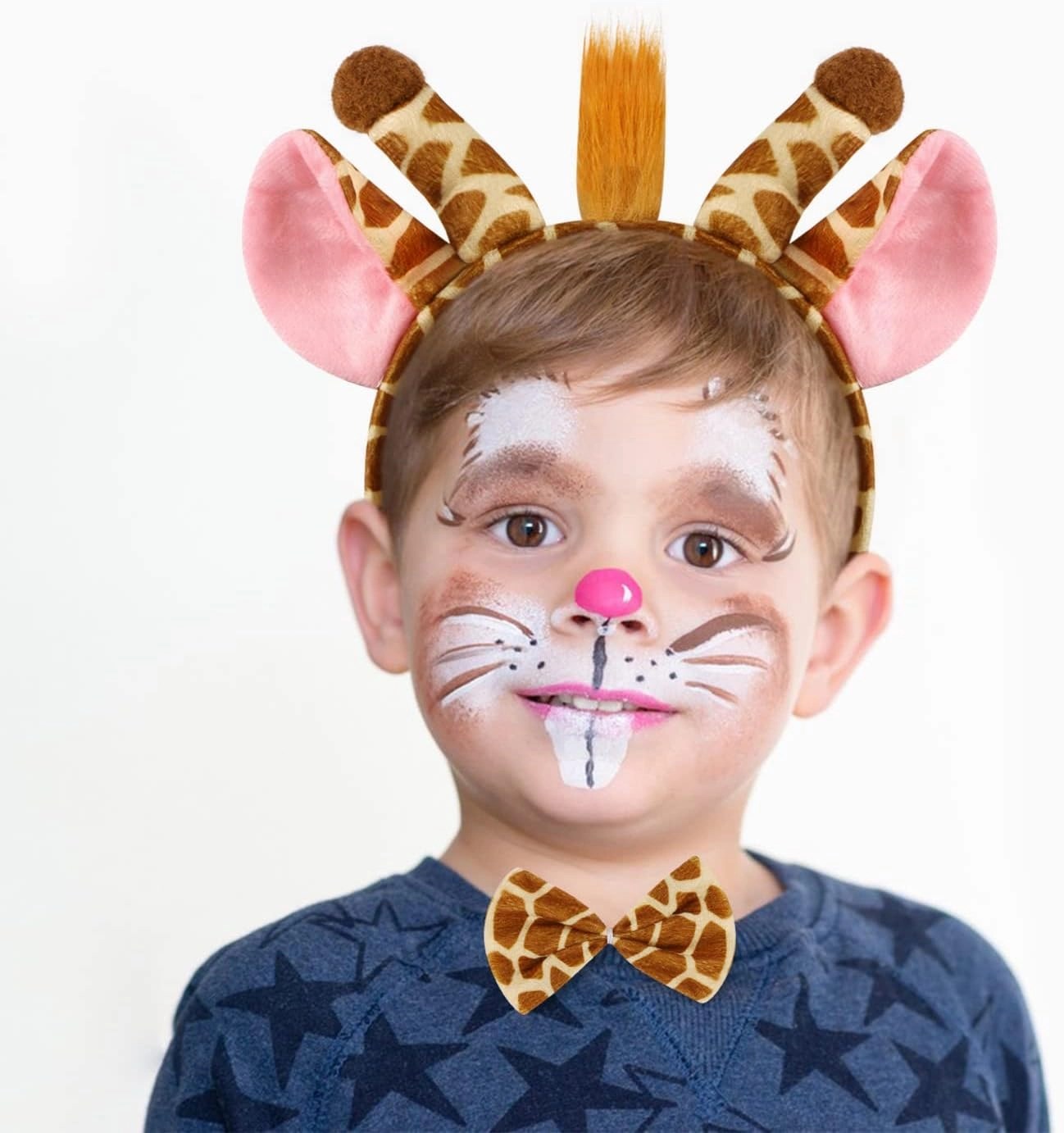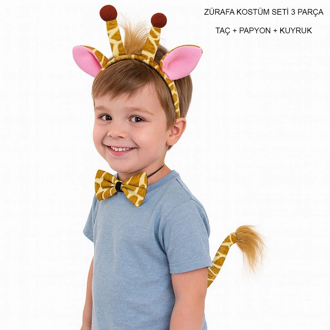 Zürafa Kostüm Seti 3 Parça, çocukların okul gösterilerinde, sahne performanslarında ve özel etkinliklerde rahatlıkla kullanabileceği sevimli ve hafif bir kostüm setidir.