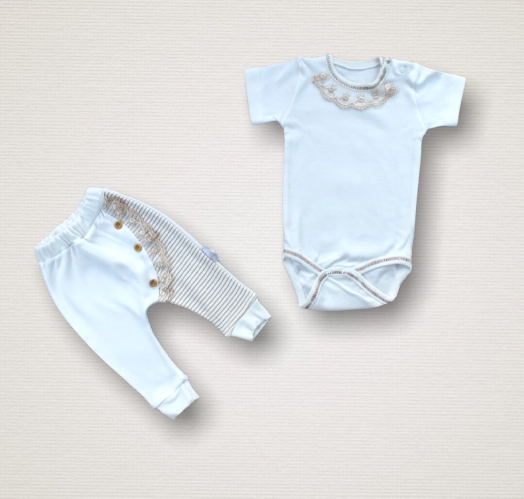 İleri nakış teknolojisi ile tasarlanmıştır. Üzerinde kullanılan çıtçıt bebek tenine temas etmemektedir. Ürünlerimizde polyester iplik kesinlikle kullanılmaz. Kullanılan ipler pamuklu veya viskon karışımlı iplerdir. Ürünlerimizin kol birleştirme, yaka birleştirme, pantolon ağ birleştirme vb. yerlerinde ki dikişler de, ürünün kullanımı esnasında, zorlanarak zarar görmesini engellemek amacıyla belirtilen kısımlarda, ekstra güçlendirilmiş dikiş şekli olan ÇİMA dikişi uygulanması şarttır. Ürünlerimizde, beden etiket numarası ve yıkama talimatı bilgilerinin ürün ensesine, ense baskısı şeklinde ve ekolojik boyalar ile boya baskı olarak uygulanmaktadır. Ürünlerimizde kullanılan çıtçıtlar nikel free sertifikalı, ekstra kaliteli çıtçıtlardır. Çıtçıt ve düğme yerleri (detayları), bebek yatarken kesinlikle bebeğe zarar vermeyecek yerlere gelecek şekilde tasarlanmıştır. Ürünlerimizde, fermuar vb. aksesuarlar uluslararası standartlarda, anne ve bebek sağlığına zarar vermeyecek şekildeki sertifikalı markalardan ve modellerden kullanılır. Ürünlerimizde, bebeğin tenine temas eden yüzeylerde, nakış arkası vb. riskli yüzeylerde ve bebeğin tenini tahriş etme olasılığı olan tüm detaylarda mutlaka tela vb. yapıştırılarak, bebeğin zarar görmesini engelleyecek gerekli önlemlerin alınması şarttır. Ürünlerimizde kullandığımız kumaş, tül, dantel vb. malzemelerin tamamının antialerjik ve anti bakteriyel özelliklerde ki malzemelerden üretilmiş olması şarttır.