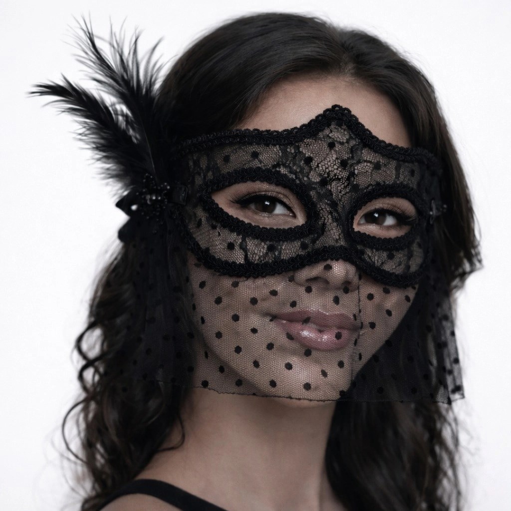Siyah Dantel Tüllü Peçeli Parti Maskesi - Tüylü İnci Detaylı
