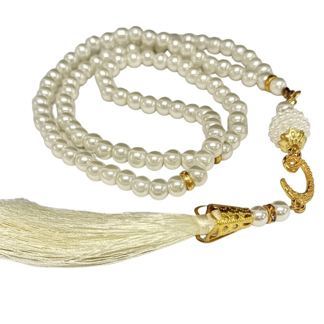 Namaz Tesbihi Vavlı 99'lu Cam İncili Esma'ul Hüsna Dua Kartı İle Krem Renk Hediyelik