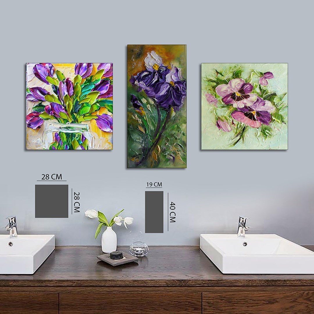 3 Parça Dekoratif Çiçekler Çizim Mdf Tablo - 3Yatay-525 30X40