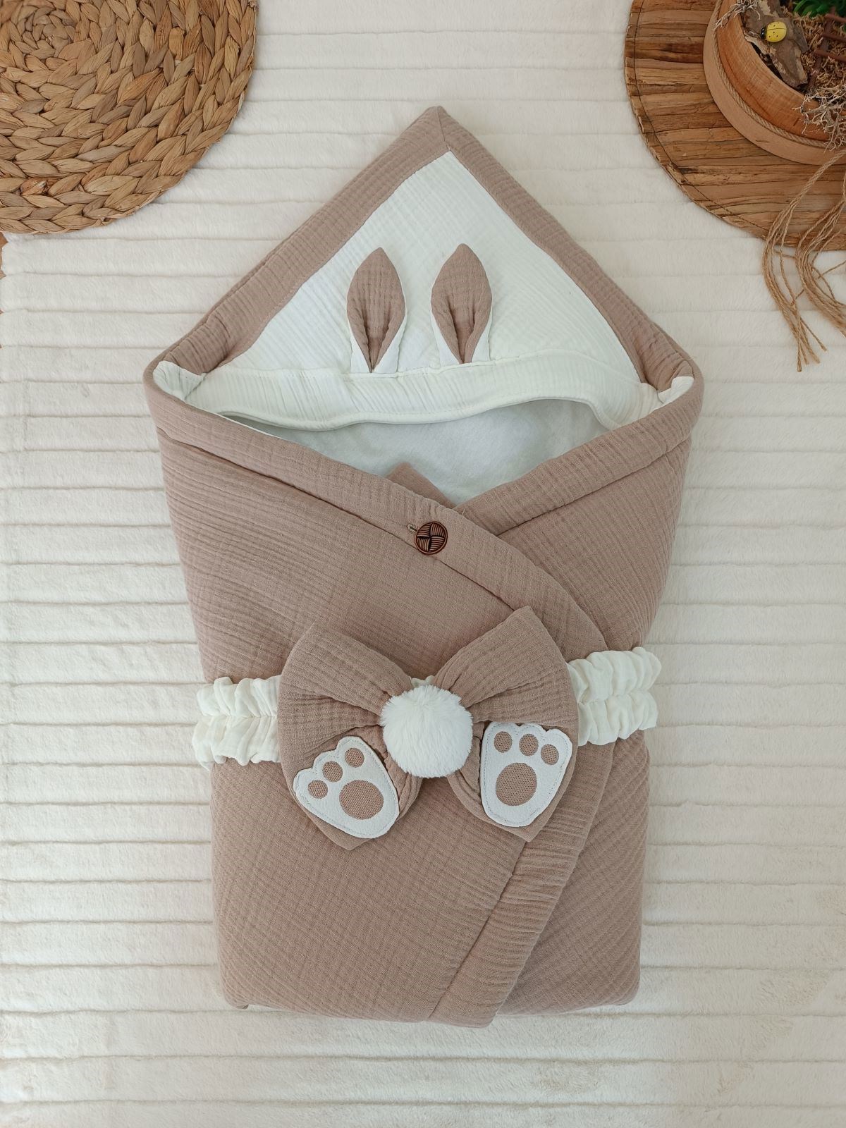 Yenidoğan 4 Kat Müslin Kumaş Kulaklı Patili Fiyonk Bebek Battaniyesi Kundak
