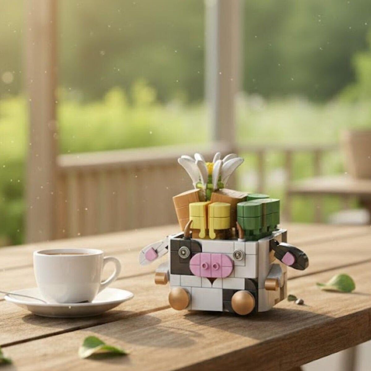 PANLOS Hayvan Saksıları Buket Setleri – İnek Model, sevimli inek figürünü renkli çiçek buketiyle birleştiren eğlenceli ve dekoratif bir block oyuncaktır.