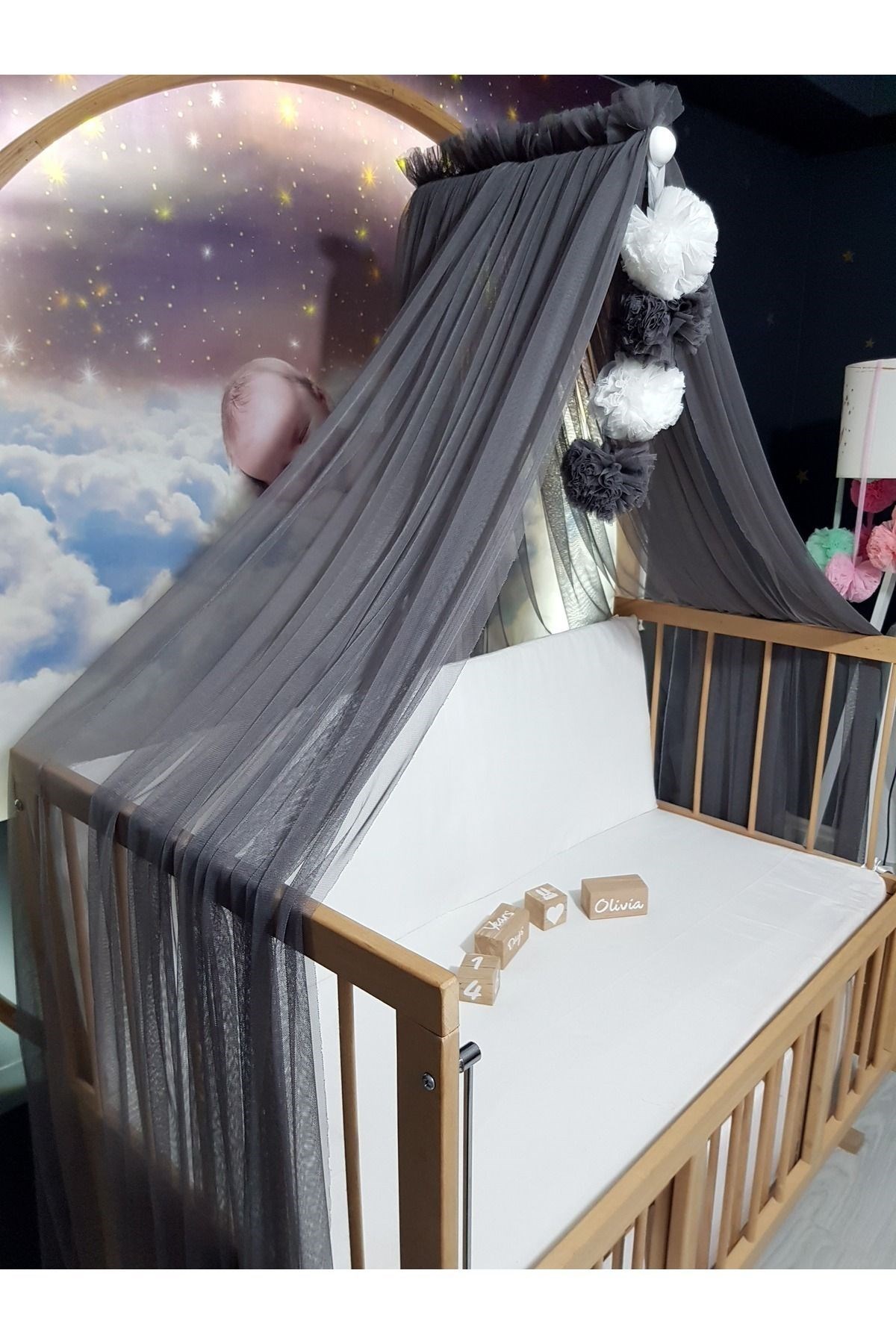 Bebek Lüks Cibinlik Takımı - Dört Ponponlu Koyu Gri Likra Tül (Cibinlik Aparatı Dahil)