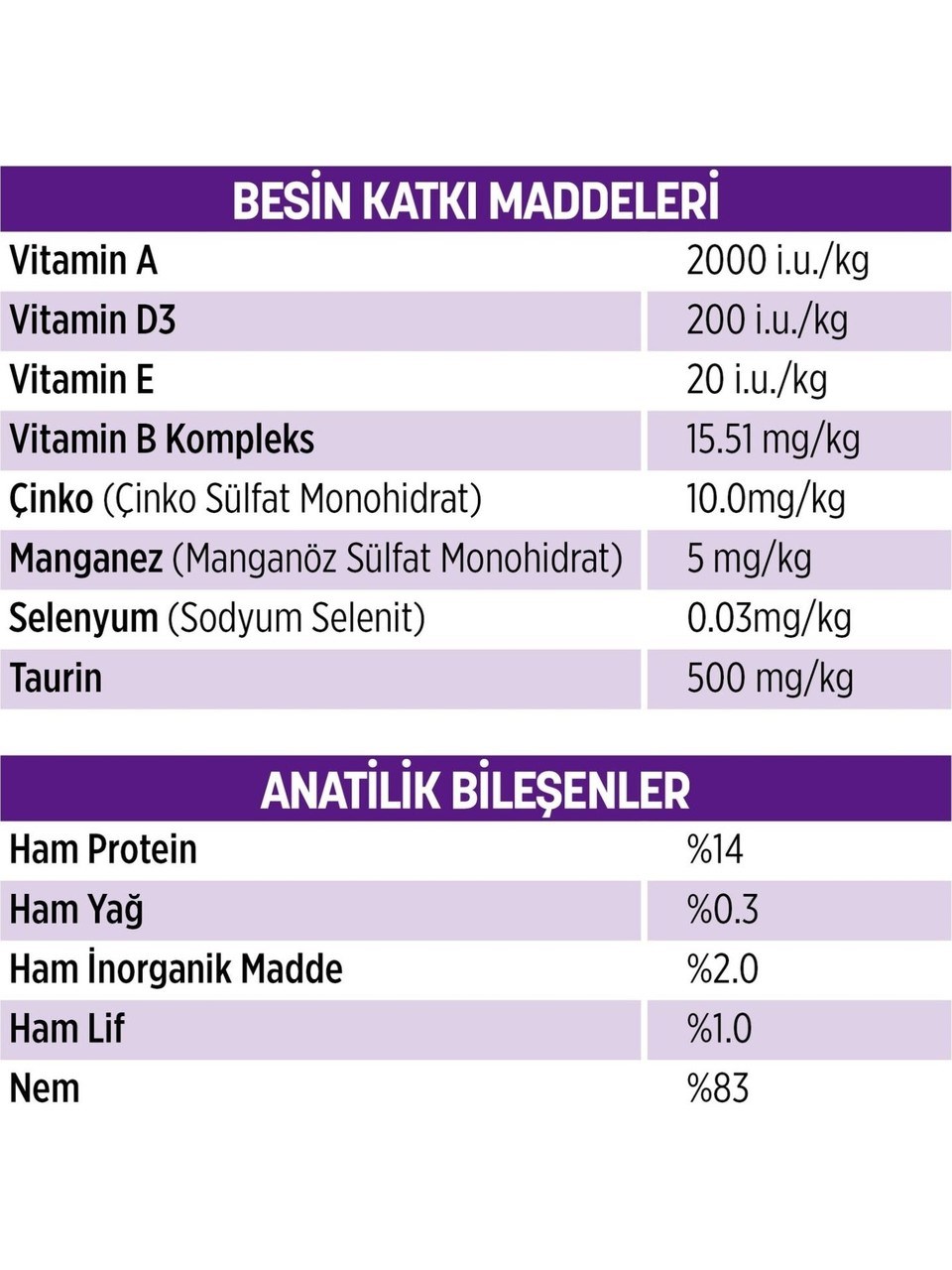 Petzzcats Ton Balığı & Midye Konserve Kedi Maması 1 Adet 70 gr Petzz Cats Ton Balığı ve Midyeli Soslu Tiftiklenmiş Yetişkin Kedi Konservesi 70 g, yetişkin kediler için özel olarak hazırlanmış tam ve dengeli yaş mamadır. Özenle tiftiklenmiş ton balığı parçaları ve midye içeriği, özel sosuyla birleşerek yüksek lezzet ve iştah açıcı bir öğün sunar. Yüksek proteinli içeriği kas gelişimini desteklerken, doğal yapısı sayesinde kolay sindirim sağlar. Yüksek nem oranı kedinizin günlük sıvı ihtiyacını karşılamaya yardımcı olur. Seçici kediler için ideal olan bu formül, günlük ana öğün veya kuru mamaya tamamlayıcı olarak güvenle kullanılabilir. Öne Çıkan Özellikler: