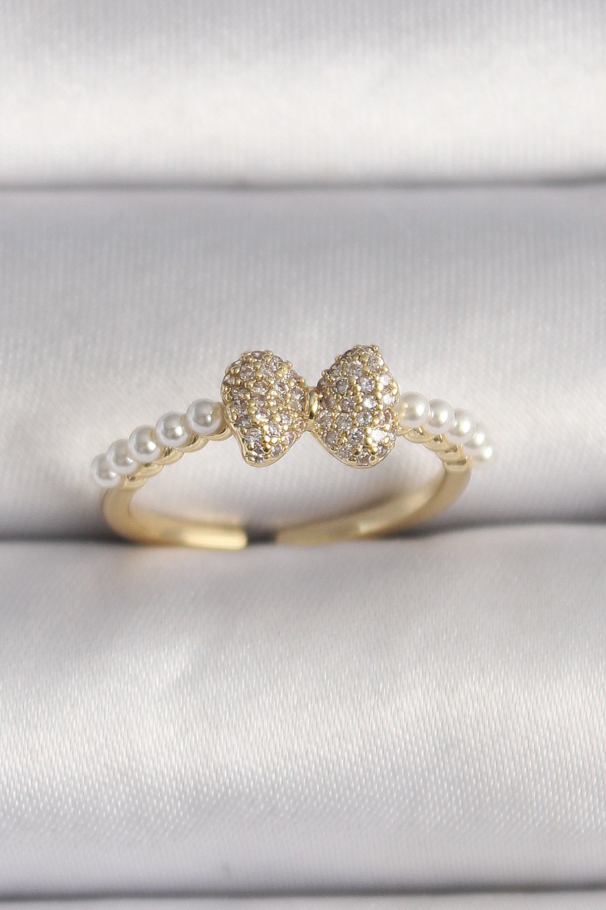 Pirinç Gold Renk Zirkon Taşlı Fiyonk İnci Detay Ayarlanabilir Yüzük