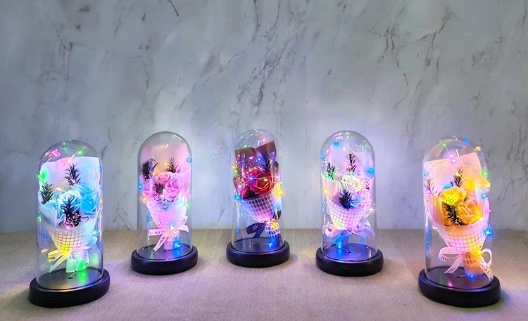 Işıklı Müzikli Fanus İçinde Gül Buketi