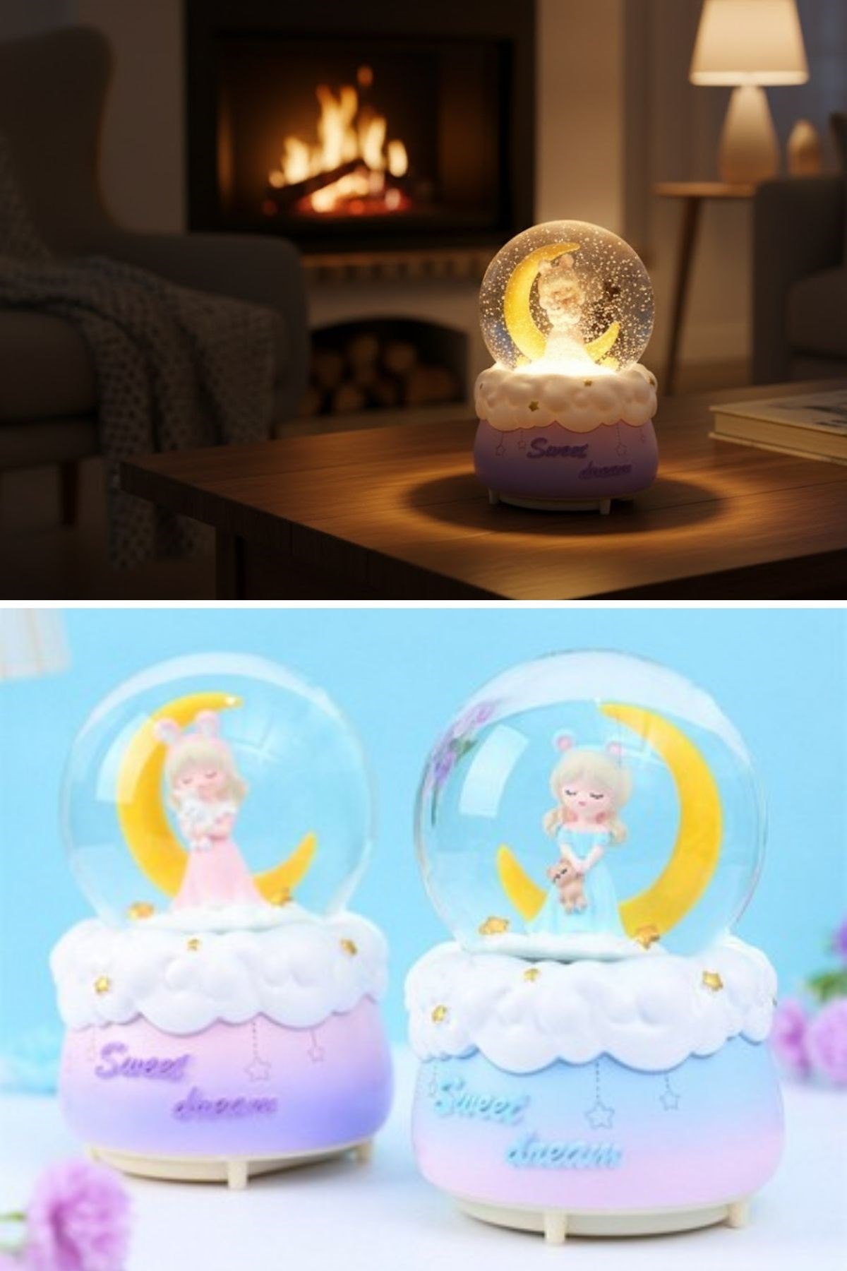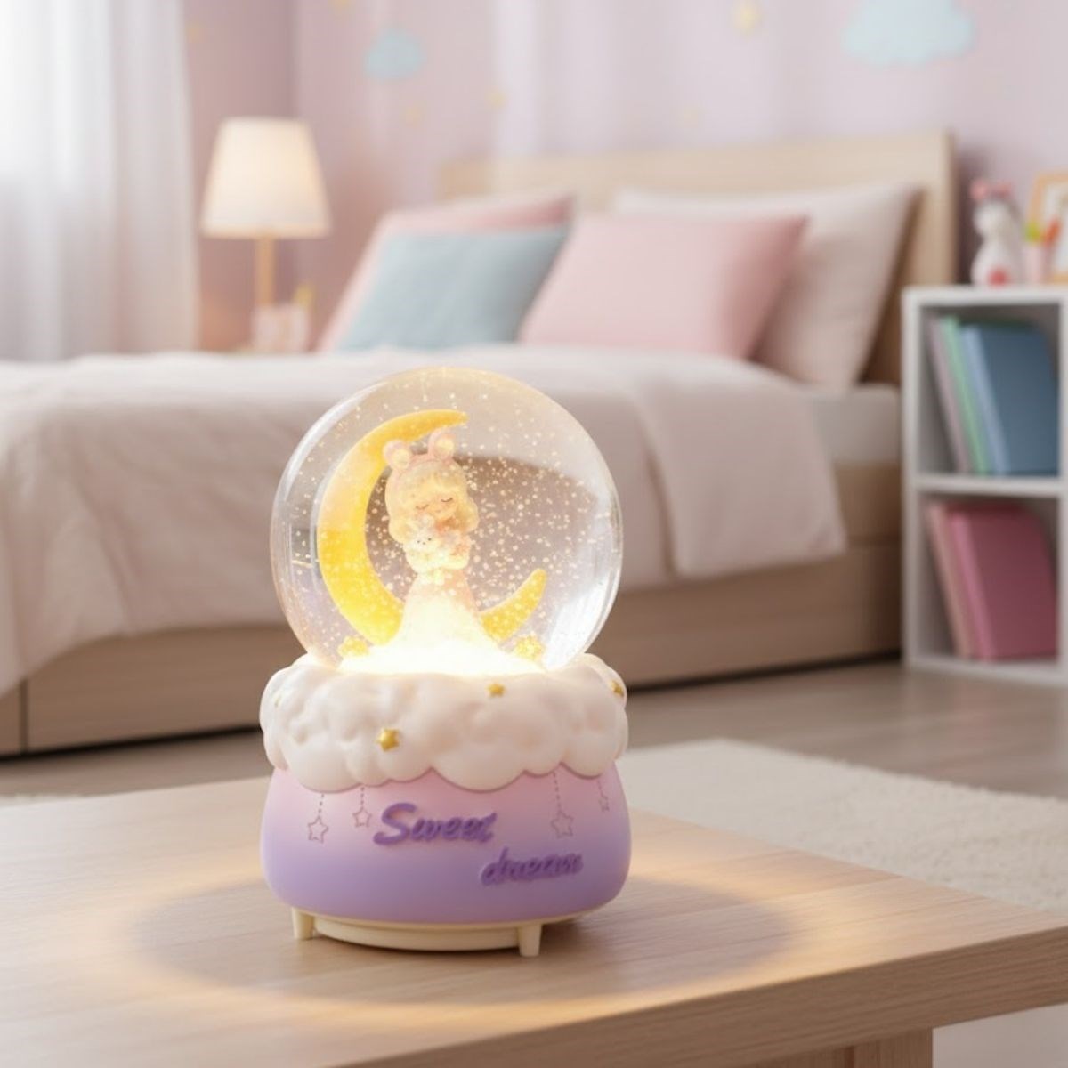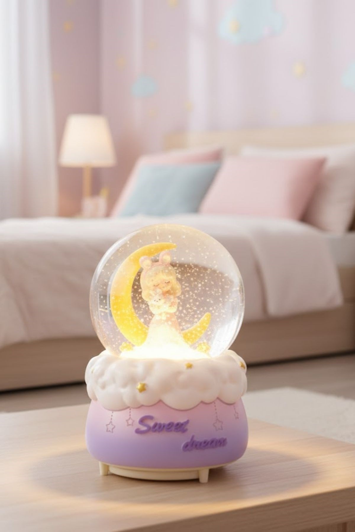 Pilli Işıklı Müzikli Kar Küresi–Hilal Ay Önünde Prenses Figürlü Eğlenceli Masaüstü Biblo, LED Aydınlatmalı Dekoratif Hediyelik Kar Küresi