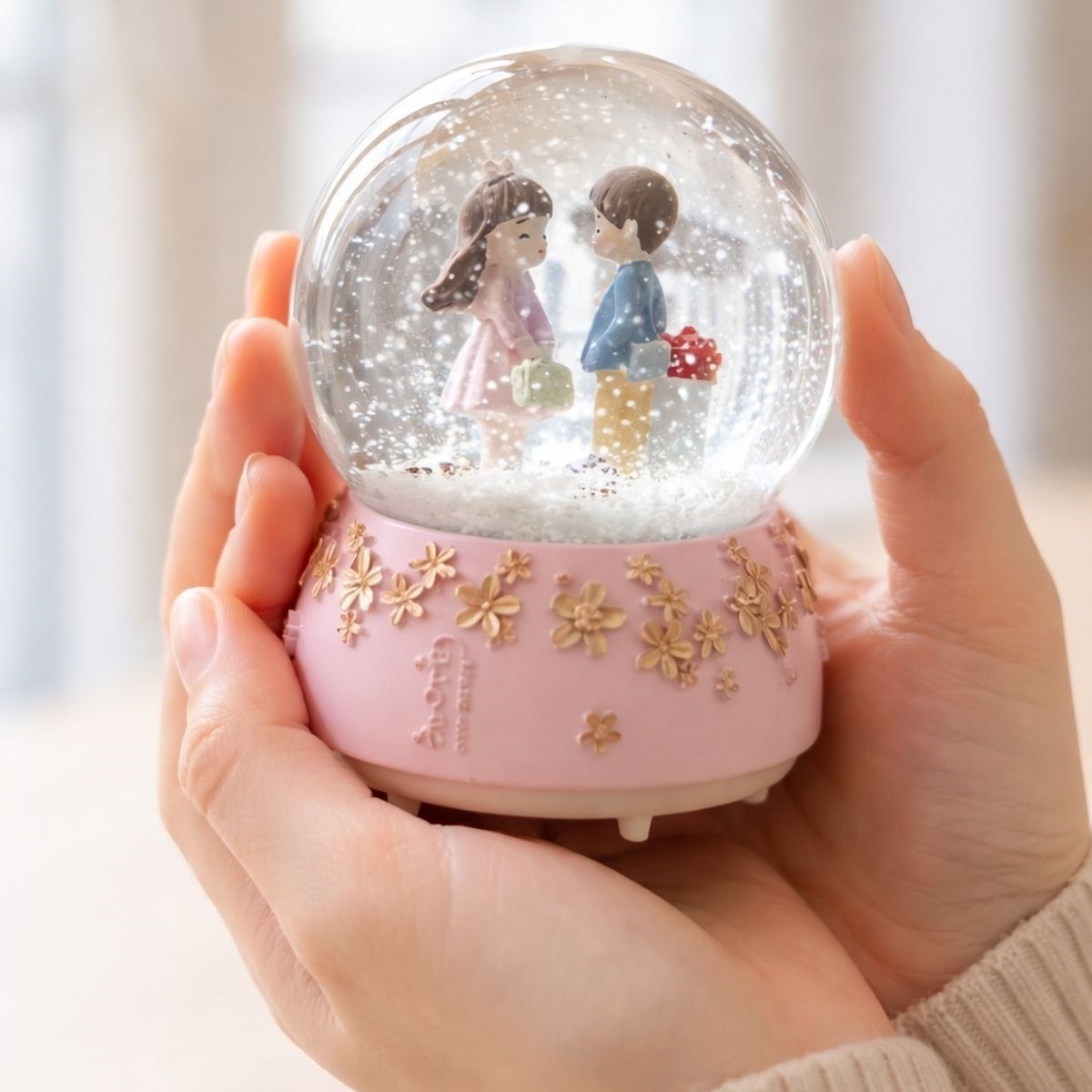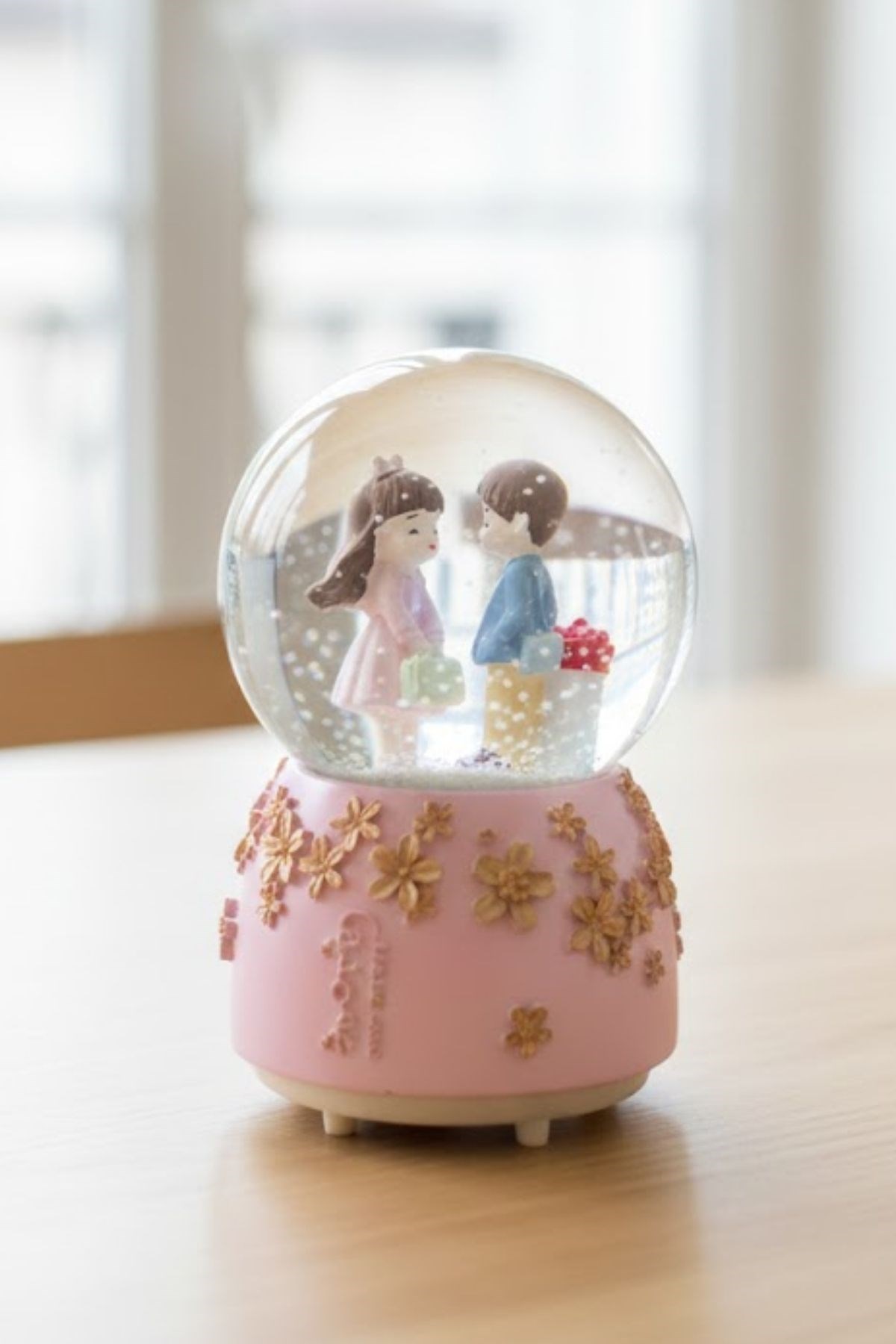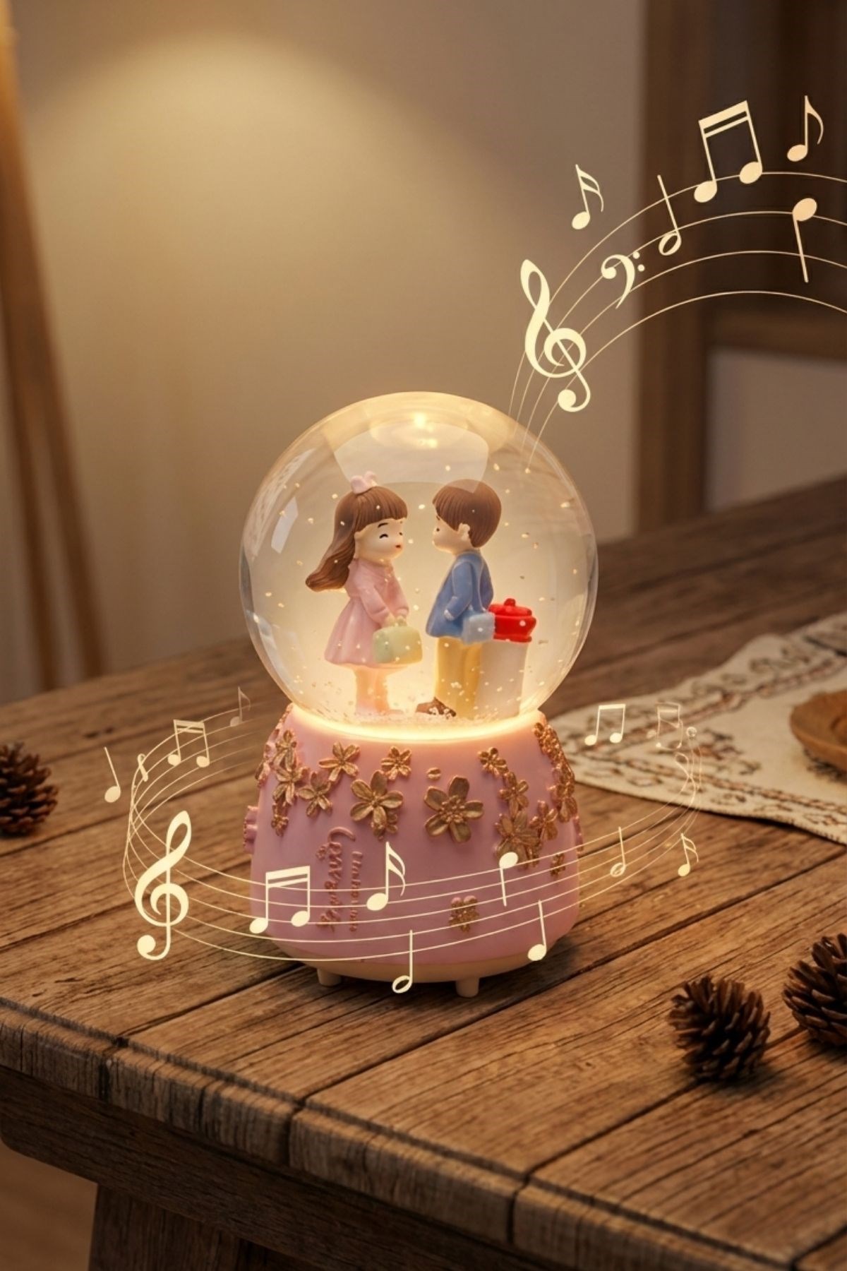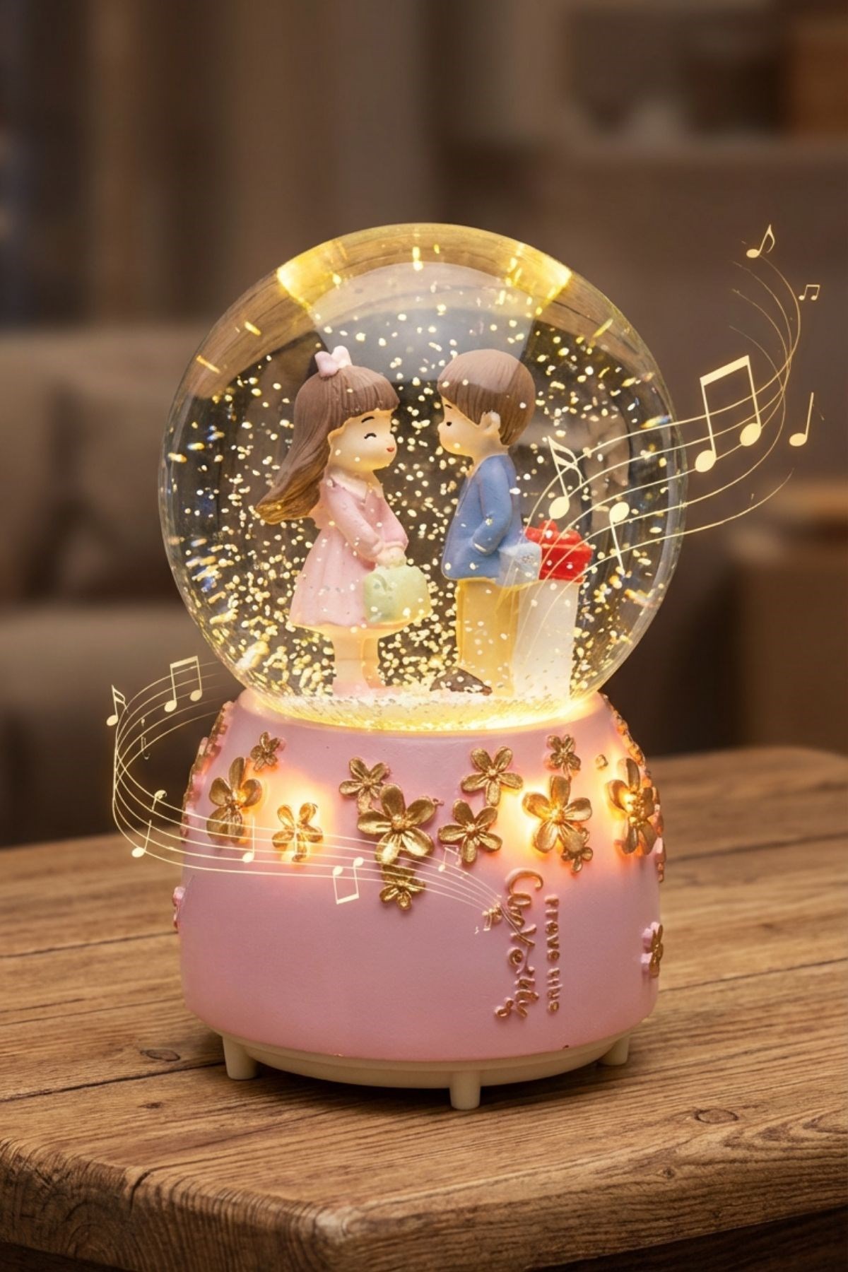 Cam fanus içinde yer alan sevgili temalı figür, sallandığında nazikçe süzülen kar efektleriyle büyüleyici bir görsel şölen oluşturur. LED aydınlatma sistemi sayesinde kar küresi karanlık ortamlarda da göz alıcı bir ambiyans yaratırken, müzik özelliği romantik atmosferi tamamlar.