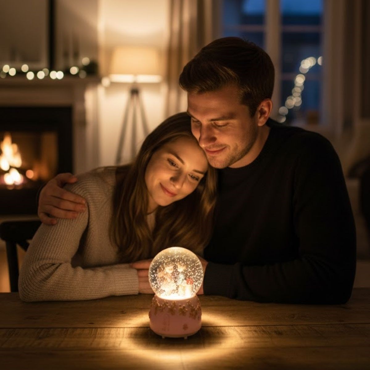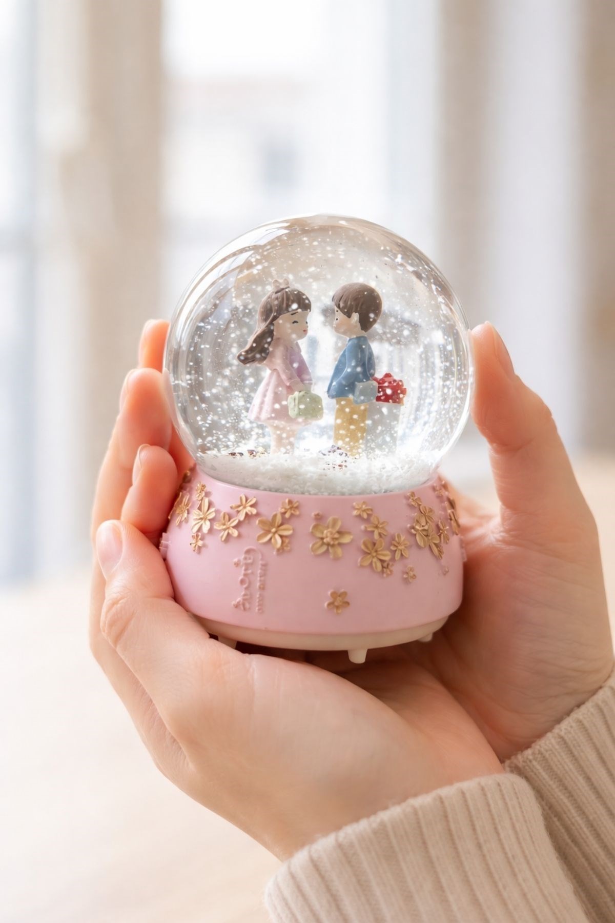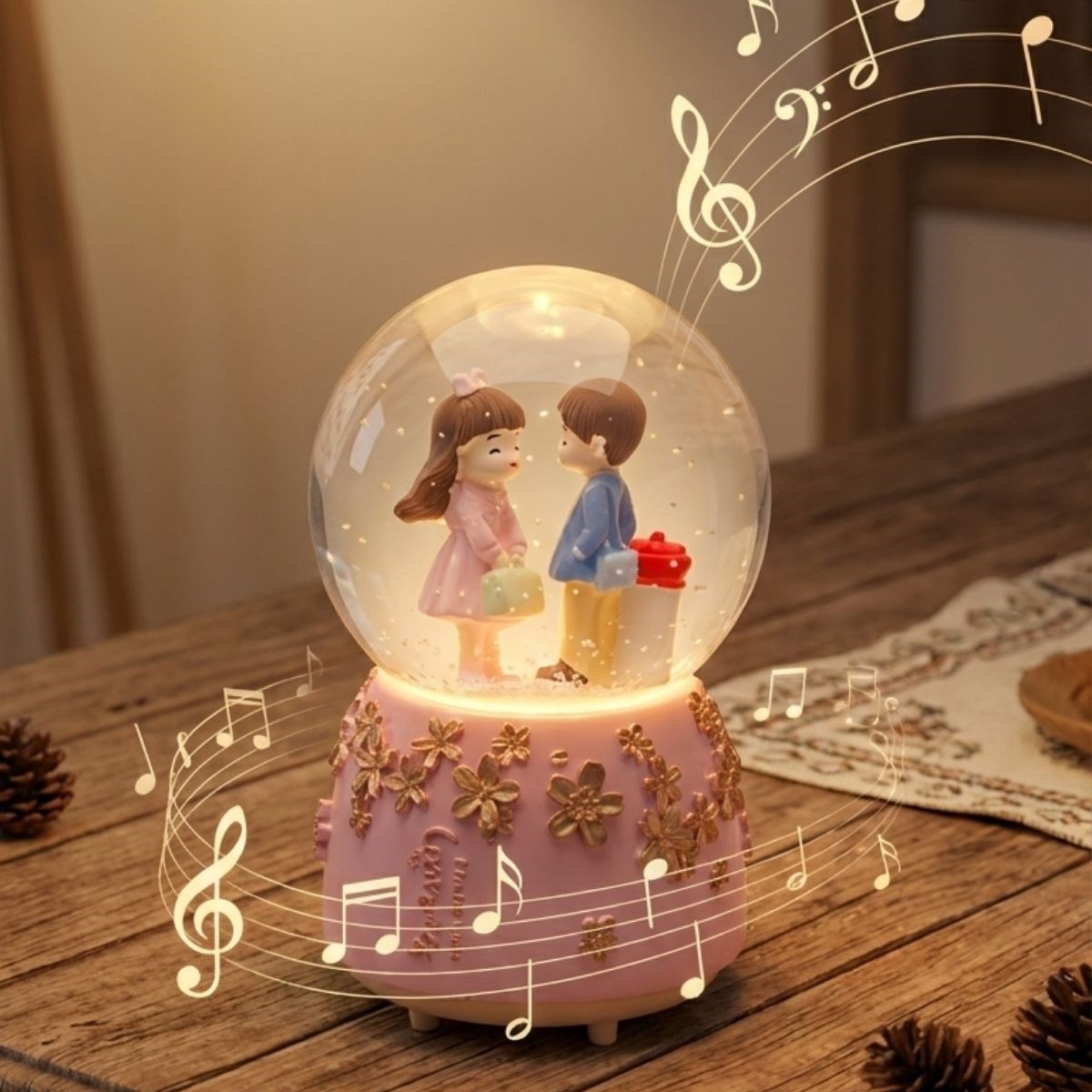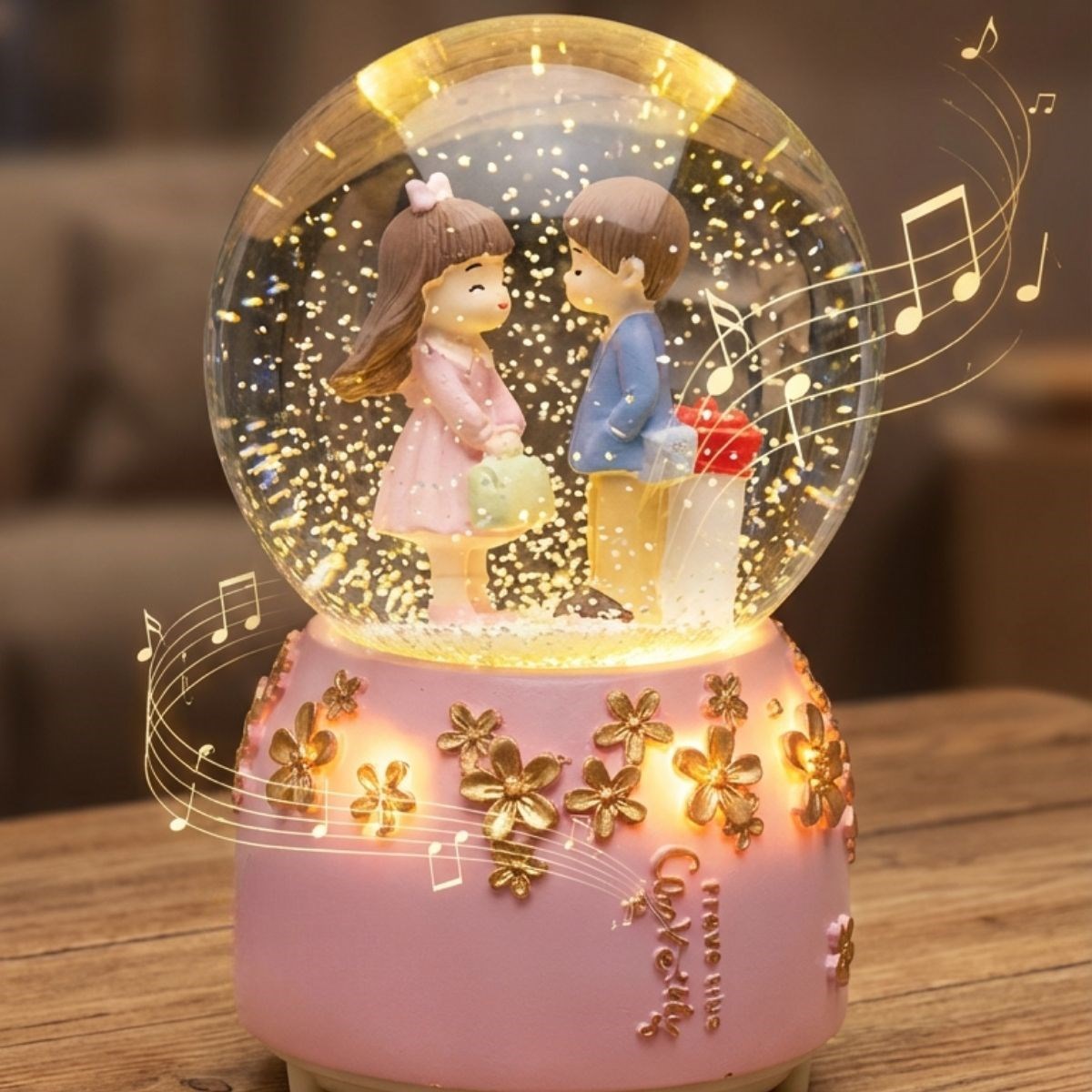 Cam fanus içinde yer alan sevgili temalı figür, sallandığında nazikçe süzülen kar efektleriyle büyüleyici bir görsel şölen oluşturur. LED aydınlatma sistemi sayesinde kar küresi karanlık ortamlarda da göz alıcı bir ambiyans yaratırken, müzik özelliği romantik atmosferi tamamlar.